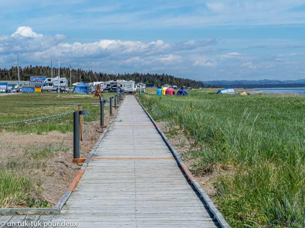 Comme entrée en matière, petite journée de 175 km, destination Les Bergeronnes. C’est au camping « Le Paradis marin » que nous faisons halte pour deux nuits et choisissons un terrain sans services sur le bord du fleuve. Un bon souper à l’extérieur (rares sans moustiques) tout en contemplant les baleines sortir souffler et se montrer le dos juste devant nous.