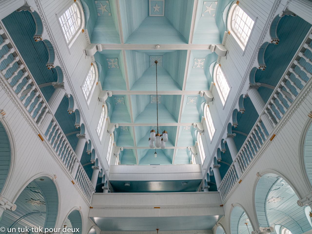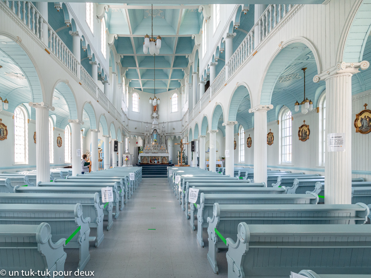 Nous voulions nous reposer un peu et y rester deux nuits, mais la quantité de moustiques en fin de journée nous a forcés à aller nous réfugier aux grands vents de Rivière-au-Tonnerre (60 km plus à l’ouest). Nous y avons visité la belle église Saint-Hyppolite où deux dames, deux sœurs à ce que nous comprenons, qui ont à cœur la sauvegarde de leur patrimoine religieux accueillent les gens. Elles étaient là pour nous raconter l’histoire de l’église peinte en bleu pâle et blanc, à l’intérieur comme à l’extérieur. Bien fières de leur joyau, elles s’attendaient bien à ce qu’on leur offre une contribution pour les travaux d’entretien. Pour le dodo, quelqu’un, la veille, nous avait parlé d’un superbe spot sur les hauteurs et un peu à l’écart du village. On ne sait toujours pas si ce terrain est privé ou non, mais il n’y a personne aux alentours et la vue imprenable, vraiment un des plus beaux bivouacs de la Côte-Nord.