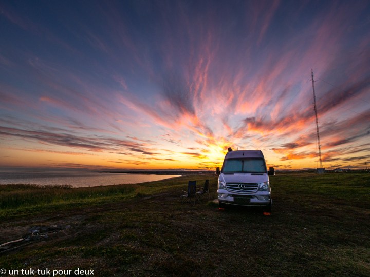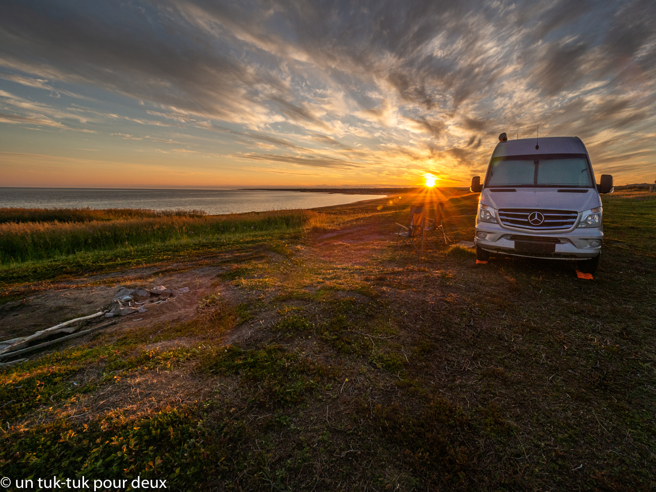 Rivière-au-Tonnerre — Bivouac qui nous en a mis plein les yeux avec cette vue imprenable sur le golfe et son magnifique coucher du soleil. On se garde une gêne pour celui-ci, car nous ne savons pas à qui appartient le terrain. On ne voudrait pas causer de problème local. Aussi, nous communiquerons l’emplacement seulement à ceux et celles qui nous en feront la demande par message personnel.