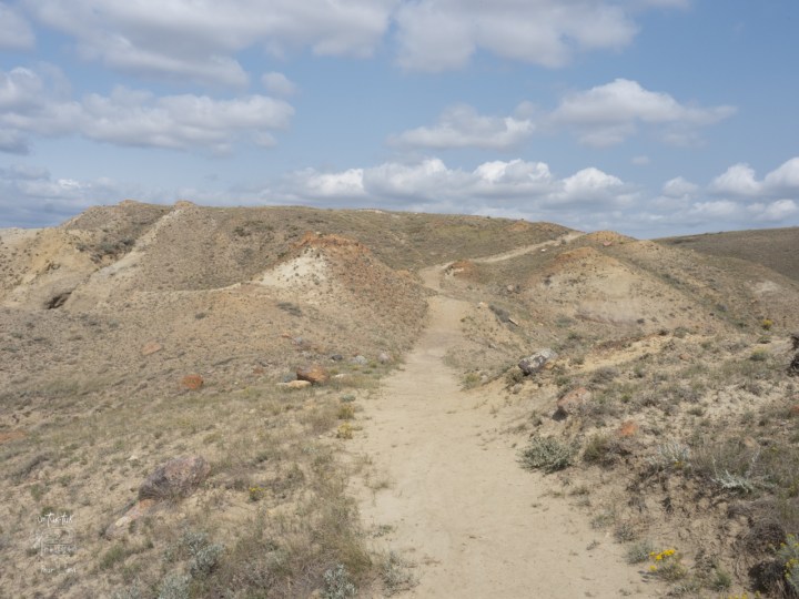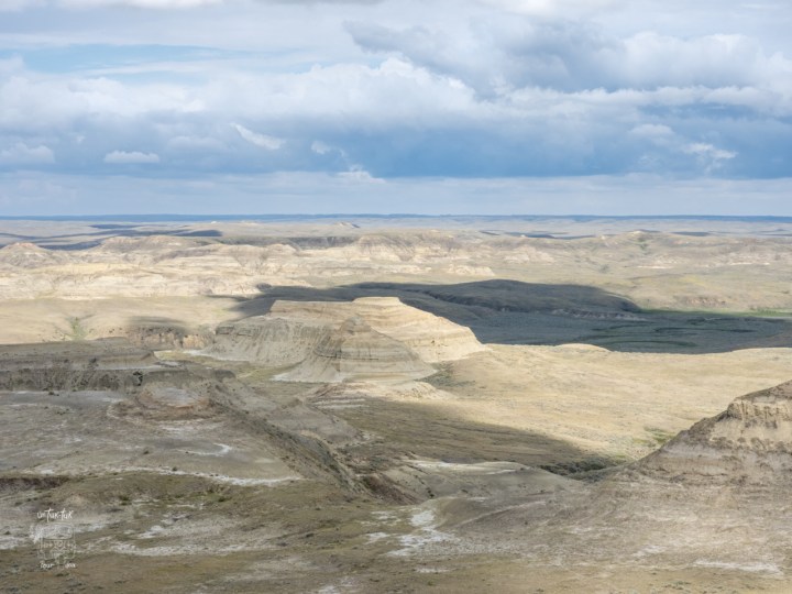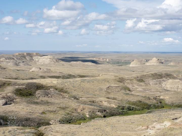 Mais le site étonnant, intéresse à plusieurs niveaux! Il est possible d’admirer la splendeur des paysages à travers ses sentiers pédestres ou en parcourant la Promenade des Badlands. Une route goudronnée de 11 km qui longe le haut de la vallée et offre des points de vue superbes. On dit que ce serait parmi les plus beaux panoramas de la Saskatchewan et nous le croyons volontiers. La précision indiquant que cette route soit asphaltée vient du fait qu’elle est la seule voie asphaltée à des centaines de kilomètres à la ronde. Ça prend bien PC pour bitumer une chemin au milieu de nulle part. Mais c’est tant mieux, car nous en avons profité vraiment en la parcourant en vélo. Wow! Quelle belle promenade! Les paysages saisissent par leur beauté! Pour vous dire combien c’est beau, outre les photos qui suivent, nous avons mis au moins deux heures pour explorer le tronçon, et ce, dans un sens uniquement.