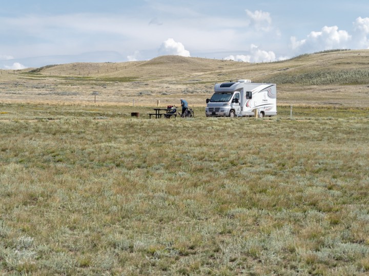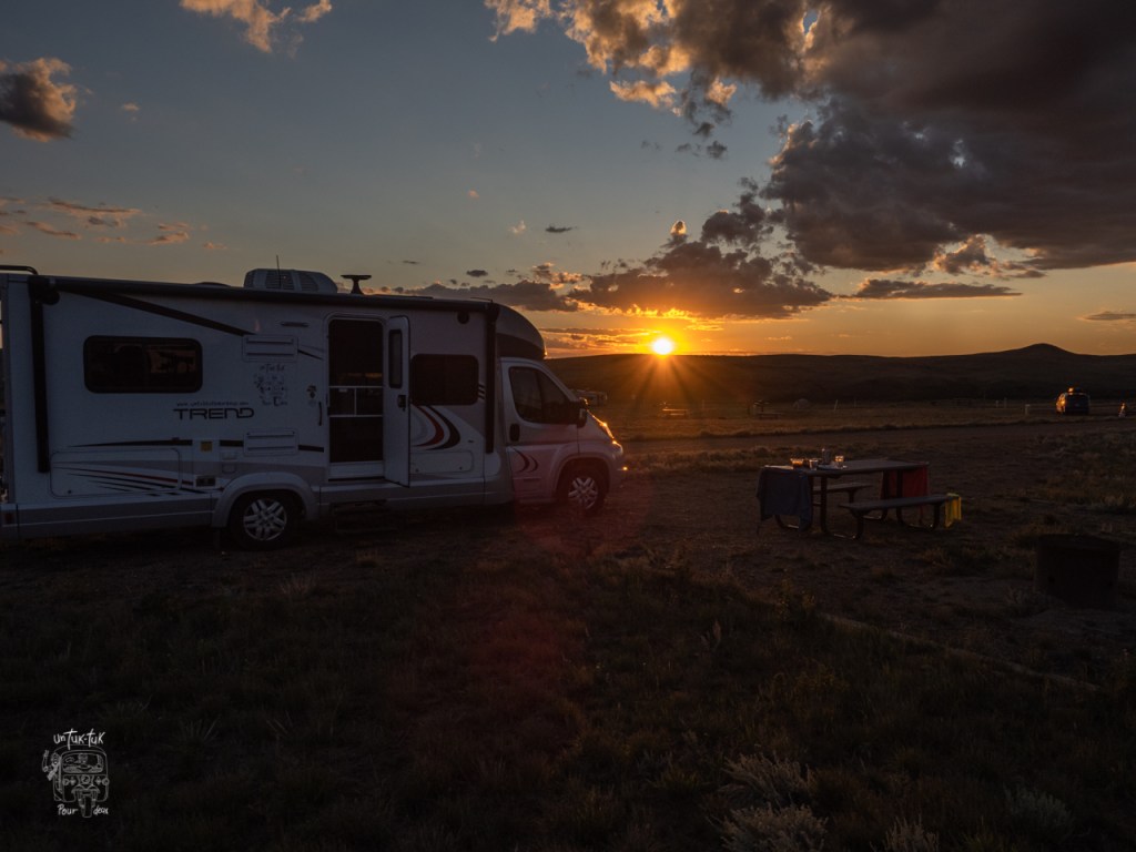 Saskatchewan, Parc national des Prairies — Camping Bloc est, camping du Ruisseau-Rock : sanidump et eau potable au robinet pour petits contenants, électricité sur chaque site, toilettes sèches. 32,35 $ CAN (tx incl.)/nuit. Bloc ouest, camping de la Frenchman River: sanidump et électricité, eau potable au robinet pour petits contenants, toilettes sèches. 32,35 $ CAN (tx incl.)/nuit. Il y a également un camping «auxiliaire» beaucoup d’emplacements sans aucun services. 16 $ CAN (tx incl.)/nuit. Wifi disponible aux centres d’accueil. Possibilité de faire le plein d’eau potable gratuitement au camping de Val Marie. Important de s’inscrire auprès de l’un des centres d’accueil à l’entrée du parc à Val Marie ou à celui du Bloc est au début du séjour. Les deux campings comptent une vingtaine d’emplacements et sont à l’instar du parc entièrement dénudés. Super tranquille. Il y a beaucoup de chiens de prairie qui nous font bien sourire et de beaux couchers du soleil.