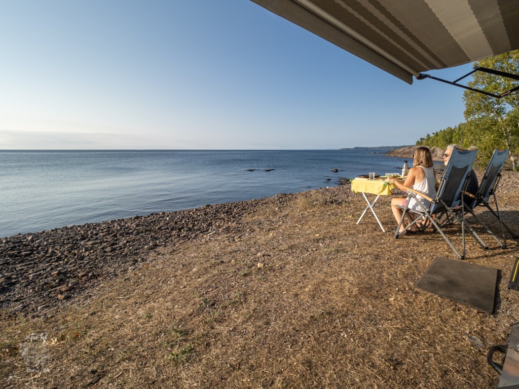 Pour la première étape de ce nouveau périple, on se doit d’abord de dérouler de l’asphalte comme on dit! Un peu plus de 3 000 km à parcourir pour atteindre notre première destination. Ce sera donc des arrêts dodos improvisés au fil du chemin dans des endroits pas toujours intéressants, mais parfois de belles surprises nous attendaient comme ce fut le cas notamment pour notre deuxième jour. Après plus de 1 100 km, dont un premier stop à NorthBay la veille, nous nous gâtons en nous arrêtant tôt dans l’après-midi dans un magnifique bivouac sur le bord du lac Supérieur, près de Pancake Bay. Dominique profite de l’eau agréable du lac pour y prendre son bain (ne jetez pas de pierre trop rapidement, elle utilise des produits certifiés biodégradables bien sûr!). Jean-Pierre a, quant à lui, préféré le confort de la douche chaude dans le VR. Une bonne nuit après un succulent souper et un magnifique coucher de soleil sur le lac vraiment immense dans cette partie. On dirait l’océan. Une belle découverte!