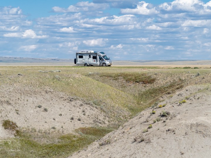 Pour la dernière journée de notre course vers l’ouest, on se rend à Moose Jaw (660 km), un peu à l’ouest de Régina en Saskatchewan. Nous écrivions plus haut que la route en Ontario était monotone, imaginez dans les plaines où se succèdent des champs et des champs à perte de vue! Le stationnement d’un beau petit parc municipal bien tranquille nous accueille pour le dodo où il pleuvra une bonne partie de la nuit. À Moose Jaw, il nous faut prévoir les choses! C’est-à-dire s’approvisionner en eau, en nourriture et en essence puisqu’il n’y aura pas grand-chose à notre destination, qui se trouve à environ 200 km au sud, juste à côté de la frontière américaine. Ici, les masques et le désinfectant à l’entrée des commerces, pfff! On ne connaît pas!