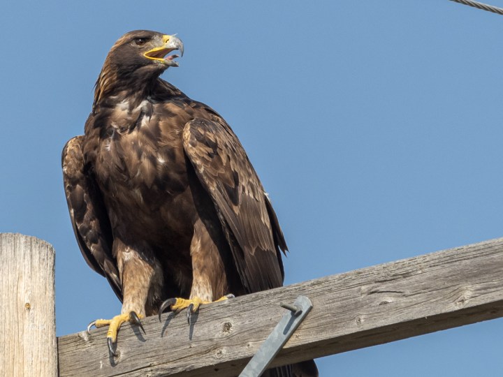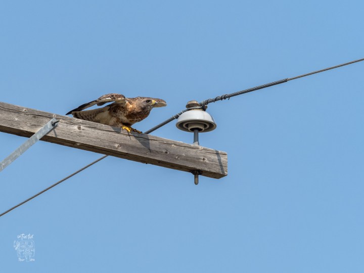 Outre d’autres colonies de chiens de prairie, une grande quantité et diversité de rapaces, dont l’aigle royal, attendaient Dominique sur les poteaux électriques le long de la route menant à Val Marie. Et à sa demande, on y passera à quelques reprises, devinez pourquoi?