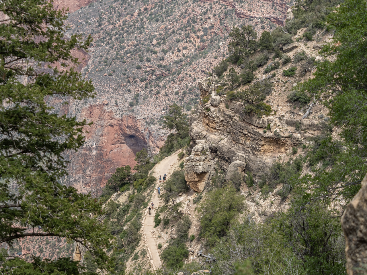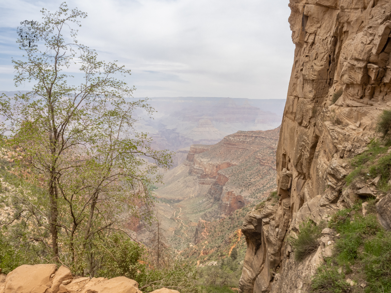 Dominique avait une idée en tête, celle de marcher la Bright Angel Trail, un sentier qui descend jusqu’au fond du canyon : 32 km a. — r. et 1300 m de dénivelé sous un soleil de plomb! Comme nous cumulions déjà plusieurs kilomètres depuis le matin et que les genoux de Jean-Pierre se faisaient sentir, nous avons négocié pour n’en faire qu’un petit bout, quelques heures tout de même! Et nous sommes remontés. Belle randonnée (la prochaine fois, nous la ferons au complet ;-)) qui s’est terminée avec un petit visiteur à quatre pattes, une chèvre… qui se nourrissait au-dessus de nos têtes!