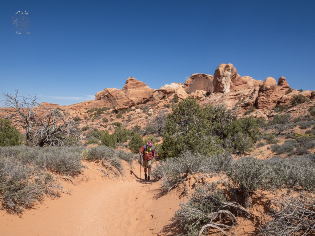 Comme vous vous en doutez, ce sont les vrais sentiers que l’on recherche. Nous filons alors pour le plus long, le Devils Garden situé tout au bout du parc, environ treize km aller-retour. Nous y sommes presque seuls et pouvons y admirer plusieurs arches, dont la Navajo Arch, la Double O Arch et la tour du Dark Angel. Très belle randonnée exigeant un peu de gymnastique dans les hauteurs par endroit et magnifique paysage!