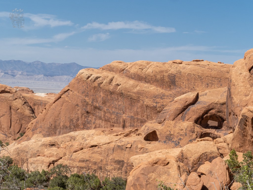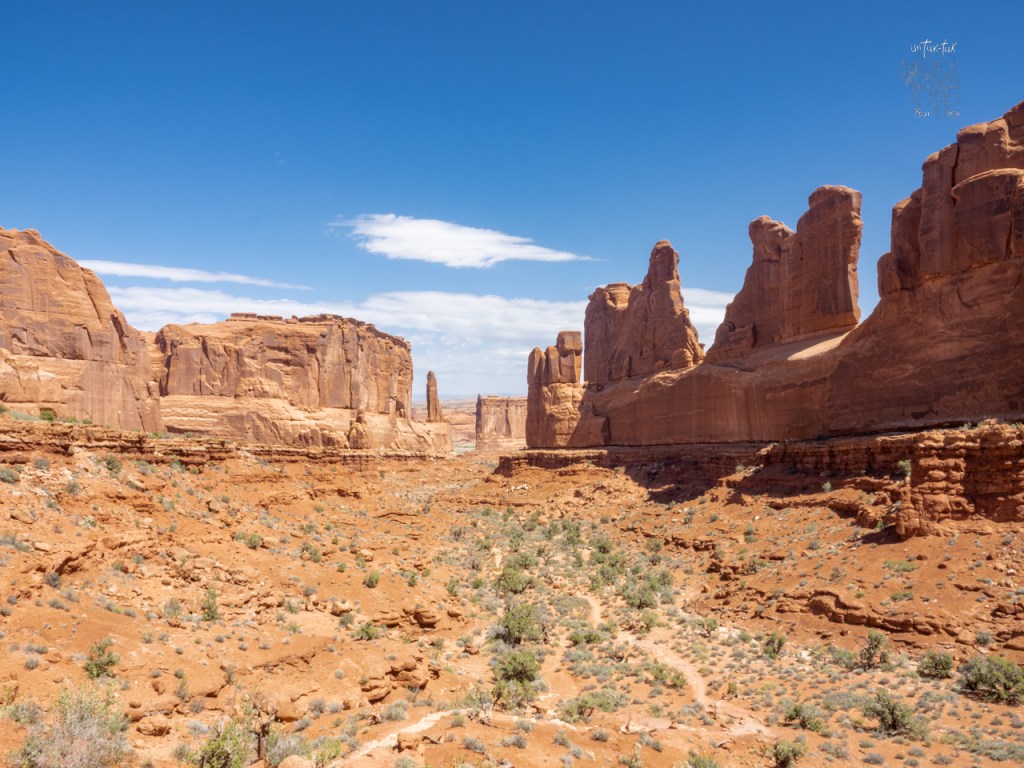 C’est l’immersion totale dans ce parc de grès rouge qui compte plus de 2000 arches naturelles. Outre leur fonction de préservation, les parcs américains sont développés pour le voyageur automobile. C’est-à-dire qu’ils comptent beaucoup de routes qui donnent accès ou presque aux principaux attraits et quelques sentiers de randonnée, plus ou moins longs et bien aménagés pour les plus aventuriers! Arches ne fait pas exception et comprends donc un parcours central de plus de 24 kilomètres avec quelques embranchements de 3 – 4 km pour voir certaines sections. En théorie, on pourrait presque le visiter sans descendre de sa voiture.