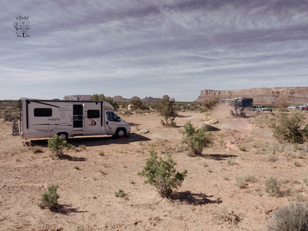 Moab, Willow Spring Road BLM—Sur iOverlander, superbe camping gratuit jusqu’au 15 mai, après cette date, 15 $ US en libre service. GPS: N 38o41.968′ W 109o41.235. Magnifique vue 360o, achalandé, mais très tranquille, toilettes sèches et emplacements pour faire un feu de camp. Attention lorsque venteux, le sable peut être contraignant. Beaucoup d’espaces et à 15 minutes de l’entrée du parc.