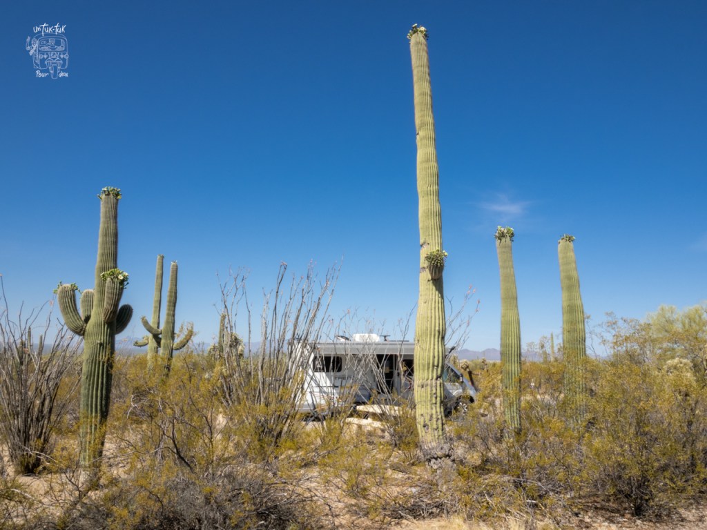 Arizona, Tucson Montain Park, Gilbert Ray Campground, à une dizaine de minutes de l’entrée du Saguaro National Park East — 20 $ US avec électricité. Une centaine de places avec réservation et 25 sites First come First Serve. Toilettes, eau, sanydump et recyclage. Magnifique camping dans le désert de cactus, fameux pour l’observation des oiseaux. Tranquille, beaux couchers de soleil. On a adoré! Nous le recommandons chaudement.