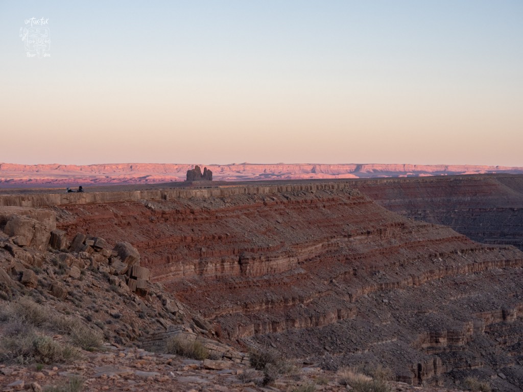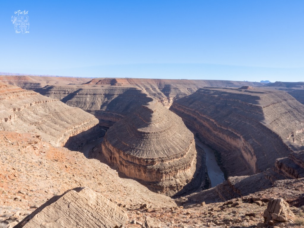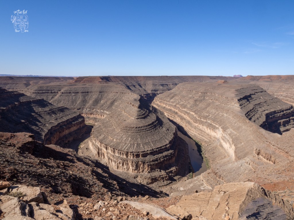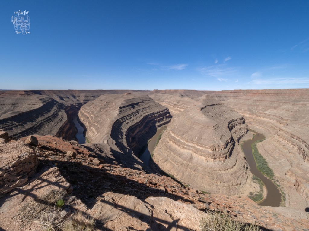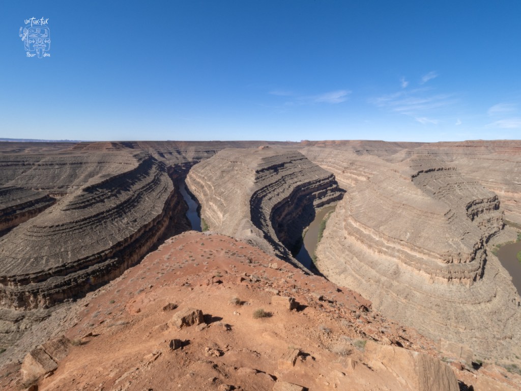 Heureusement, la journée se termine avec la très belle découverte du Goosenecks State park. Nous cherchions un camping dans les environs et ce parc insolite s’est présenté à nous un peu par hasard. Un magnifique hasard! Spectaculaire! Après la guérite d’entrée, rien… aucune végétation, que de la roche… On constate alors que nous sommes en bordure de canyons en forme de cous de cygnes façonnés au fil des temps par la San Juan River située quelques … 300 mètres plus bas. Que la nature est surprenante! Immédiatement, nous avons une pensée pour le Horseshoe Bend en Utah. À la différence que ce dernier est envahi par une horde de touristes de l’ouverture à la fermeture du site alors que Goosenecks en est presque épargné et cerise sur le sunday, nous pouvons y dormir la nuit. Que demander de plus! ¡Magnifico! C’est la tranquillité garantie!