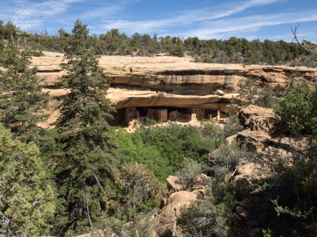 Quelques centaines de kilomètres plus à l’est, se trouve le Mesa Verde National Park au Colorado. C’est notre cible de la journée. Le parc sauvegarde les vestiges archéologiques ancestraux puebloans les mieux préservés des États-Unis. Les premières maisons troglodytes ont été construites vers la fin du XIIe siècle et le plus gros «village» compte environ 150 pièces. En arrivant, nous obtenons une place dans le camping. Mais après avoir complété la réservation, la préposée nous informe que la plupart des sentiers menant aux sites sont fermés. %$#@&$# Shit! On s’y dirige quand même et réussissons à les voir de loin. Impressionnant ce mode de vie puisque le village est accroché à la mi-falaise. En tout cas, les habitants étaient bien protégés des animaux et très bien structurés. On ne peut en dire autant du côté du parc. Grande déception. Même le camping ne mérite pas le détour. Tant pis pour cette fois-ci, on ne peut pas être enthousiasmés tout le temps, n’est-ce pas!