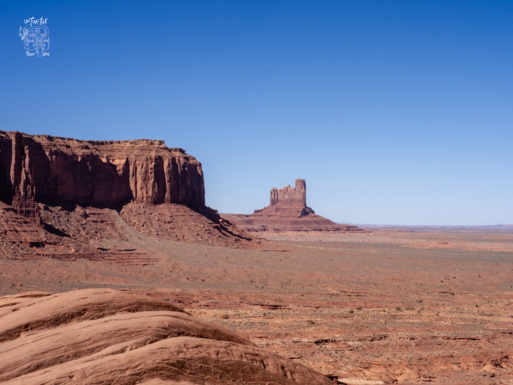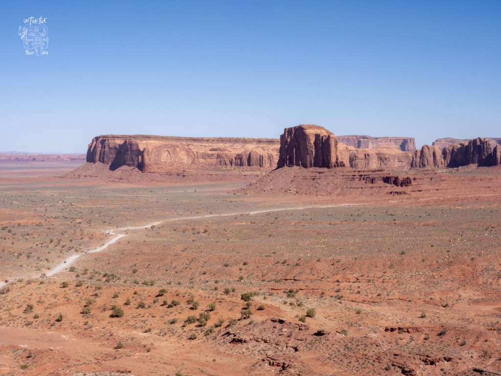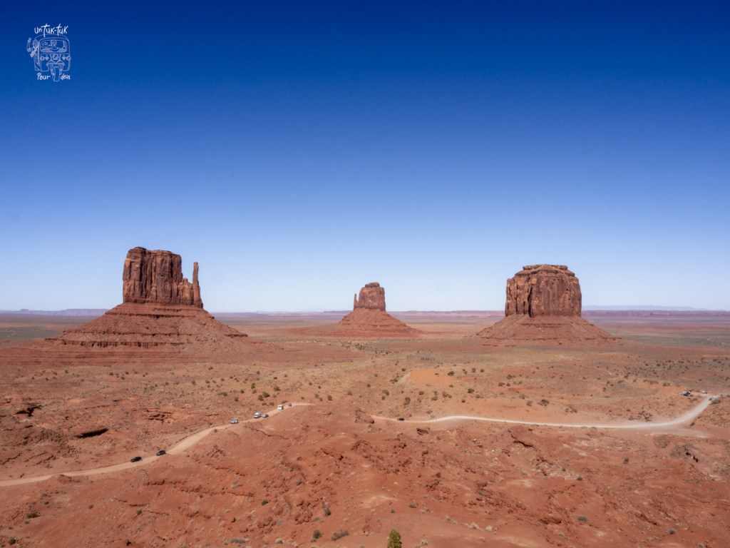 À la suite de notre troisième visite au Saguaro National Park, c’est la route vers le nord-est que nous empruntons pour nous rendre au Monument Valley en Arizona (675 km en passant par Phoenix et Flagstaff). Ces «monuments» sont situés en territoire Navajo et, pour les voir, nous devons d’abord aller au centre d’information touristique et payer un droit d’entrée de 10 $. De là, il est possible de prendre un tour guidé en jeep (privé ou en groupe) ou de prendre avec notre tuk-tuk une petite route de 27 km en sable pour circuler entre les formations de grès rouge. La préposée à l’accueil nous assure qu’il est possible de prendre cette route avec notre véhicule. Aucun problème! Ben oui toi! De la terrasse du centre, les plus beaux monuments du site ont fière allure et l’on voit très bien la piste de sable en contrebas. Mais elle ne nous inspire pas confiance du tout. Trop risqué de s’y aventurer avec notre tuk-tuk et on décide un peu rageusement de ne pas y descendre d’autant plus que, de notre point de vue du moins, c’est la perspective lointaine de ces « buttons » qui sortent de terre qui est intéressante. C’est de là que sont pris les clichés typiques qui incitent les touristes à visiter ce Park. On ne s’attarde donc pas trop!