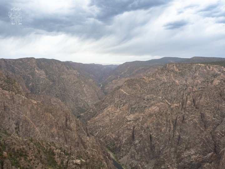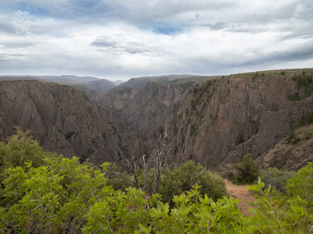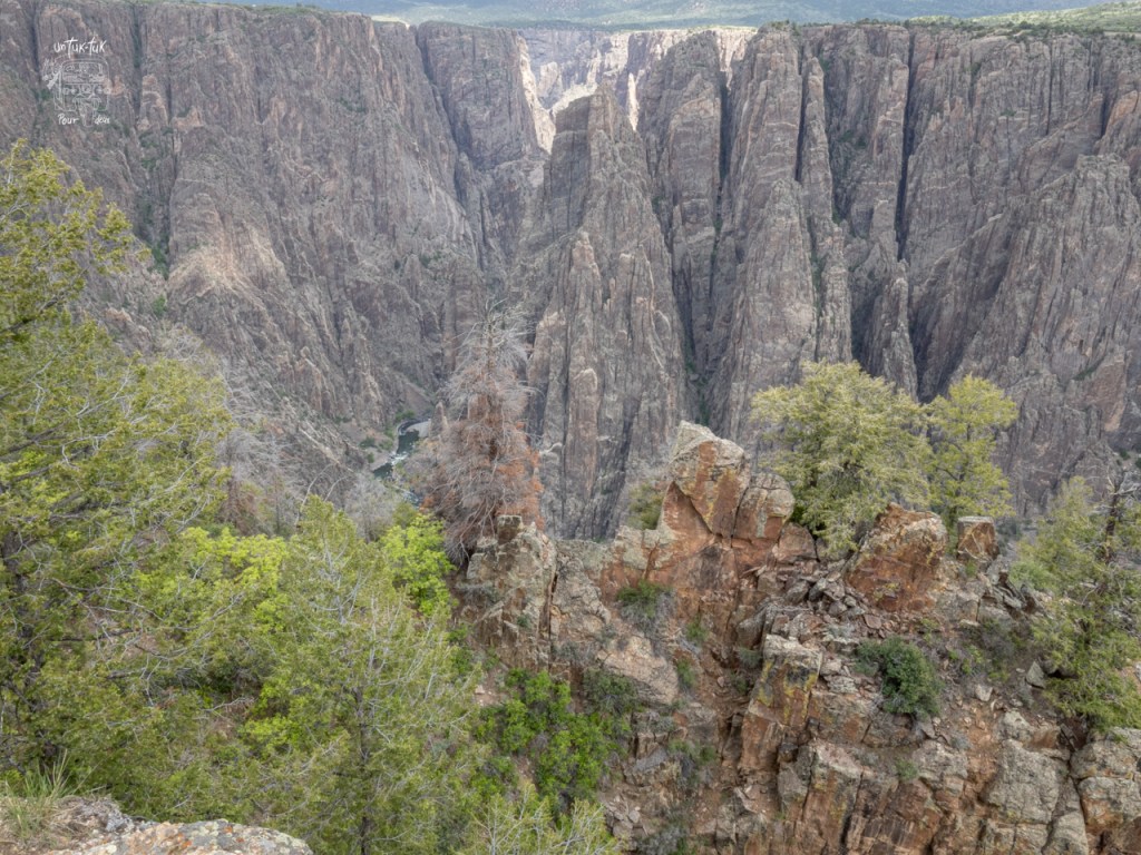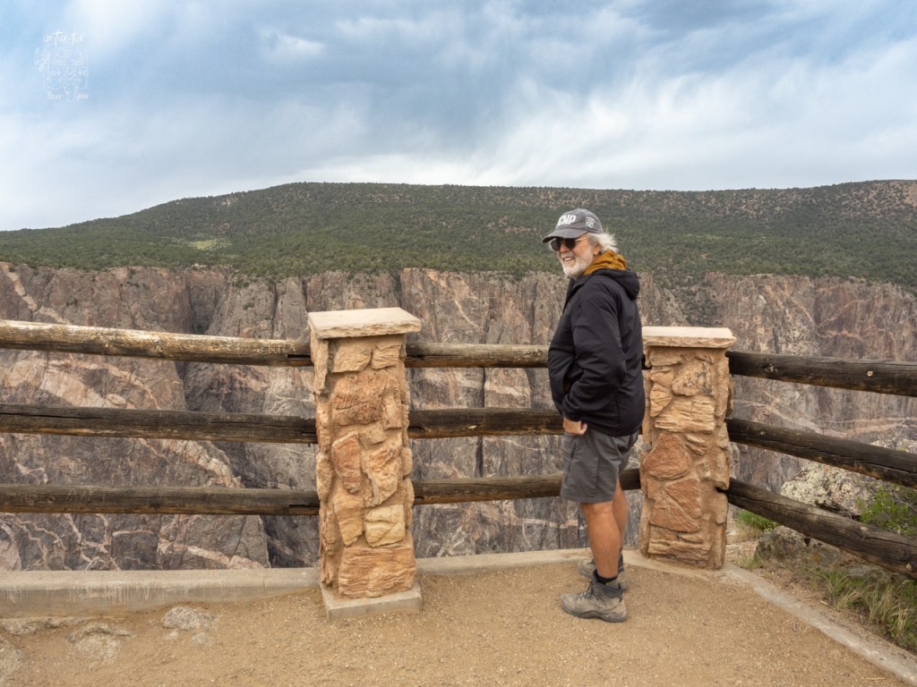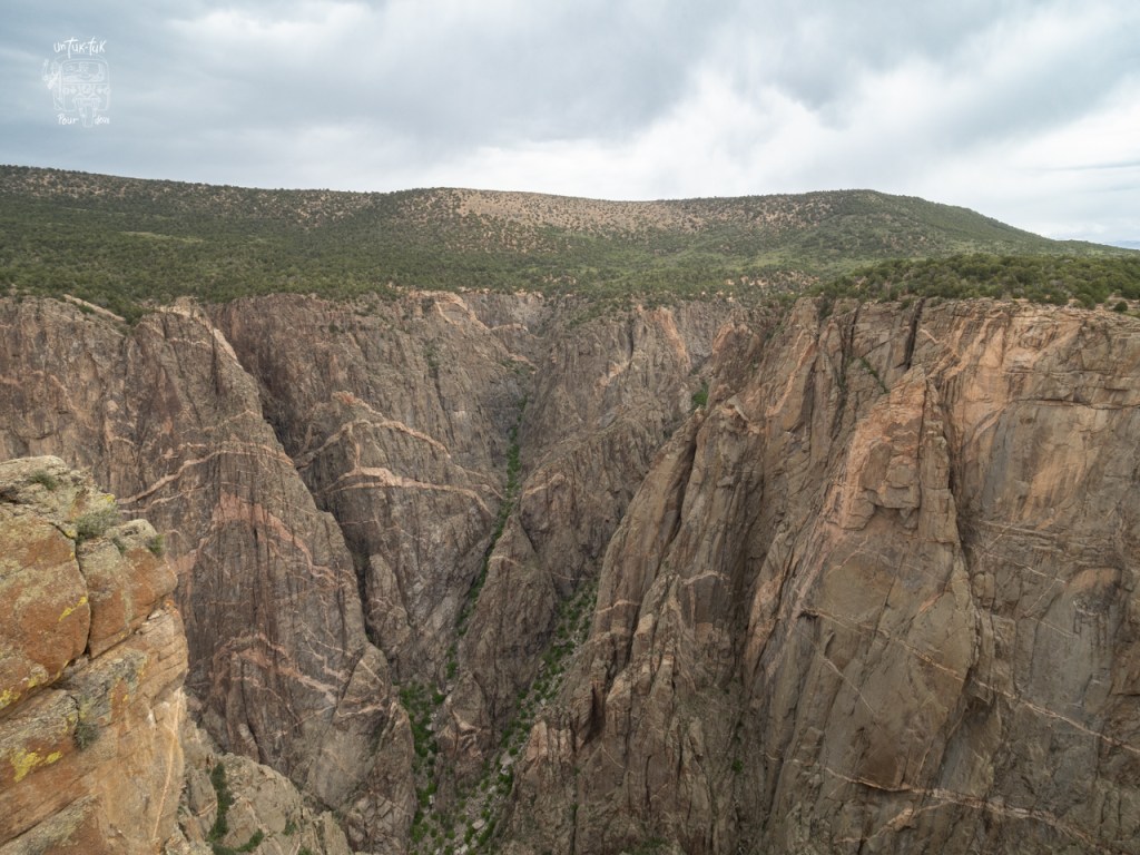 Après notre visite chez les cowboys, nous prenons la direction du «Canyon noir» de la rivière Gunnison, situé juste à côté de la ville de Montrose où on a dormi au Walmart le soir parce qu’il n’y avait plus de place dans le mini camping. En fait, oui il y avait bien une place dans le parc, mais trop petite pour notre tuk-tuk. Alors, nous revenons le lendemain matin pour sa découverte. Mais là, terminés les jaunes et ocres de l’Utah. Avec ses quelques 800 m de profondeur et son étroitesse par endroit, le canyon et ses tons de brun, noir et gris diffèrent des autres canyons, mais il impressionne autant. Il doit sa couleur foncée au gneiss et au schiste qui le composent. On se dit que l’enfer doit ressembler à ça un peu ;-).