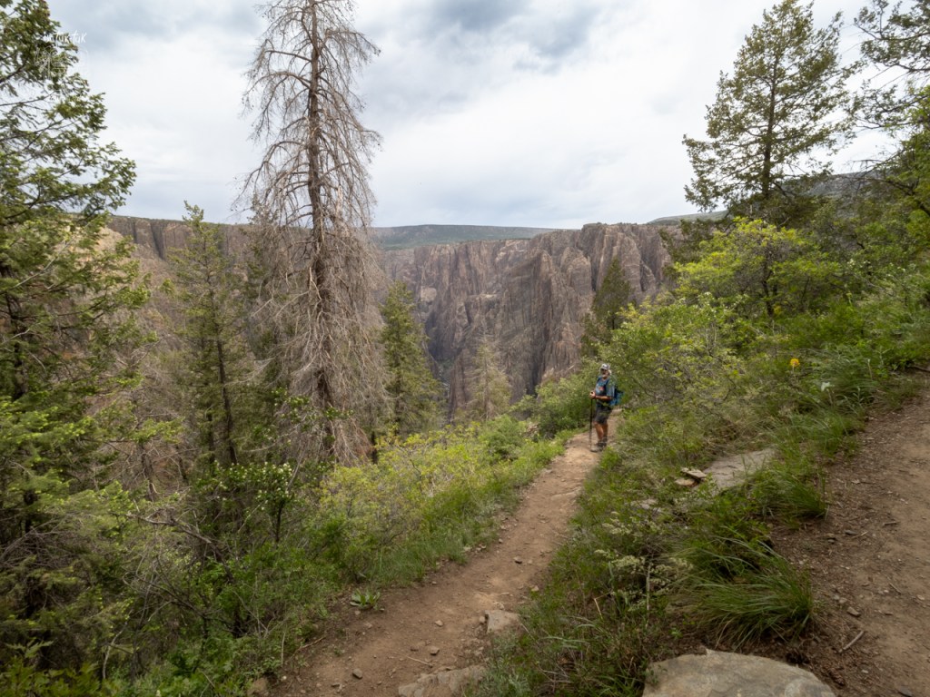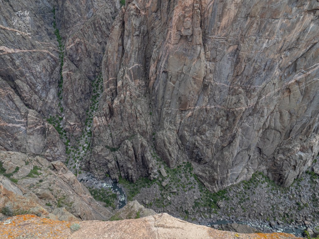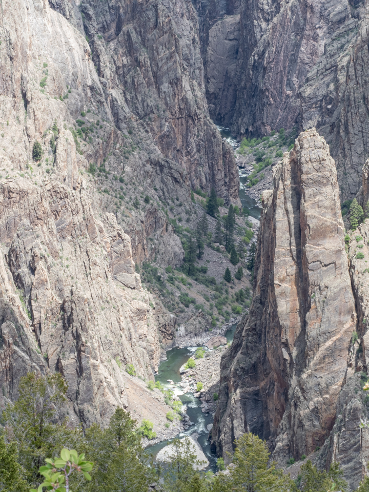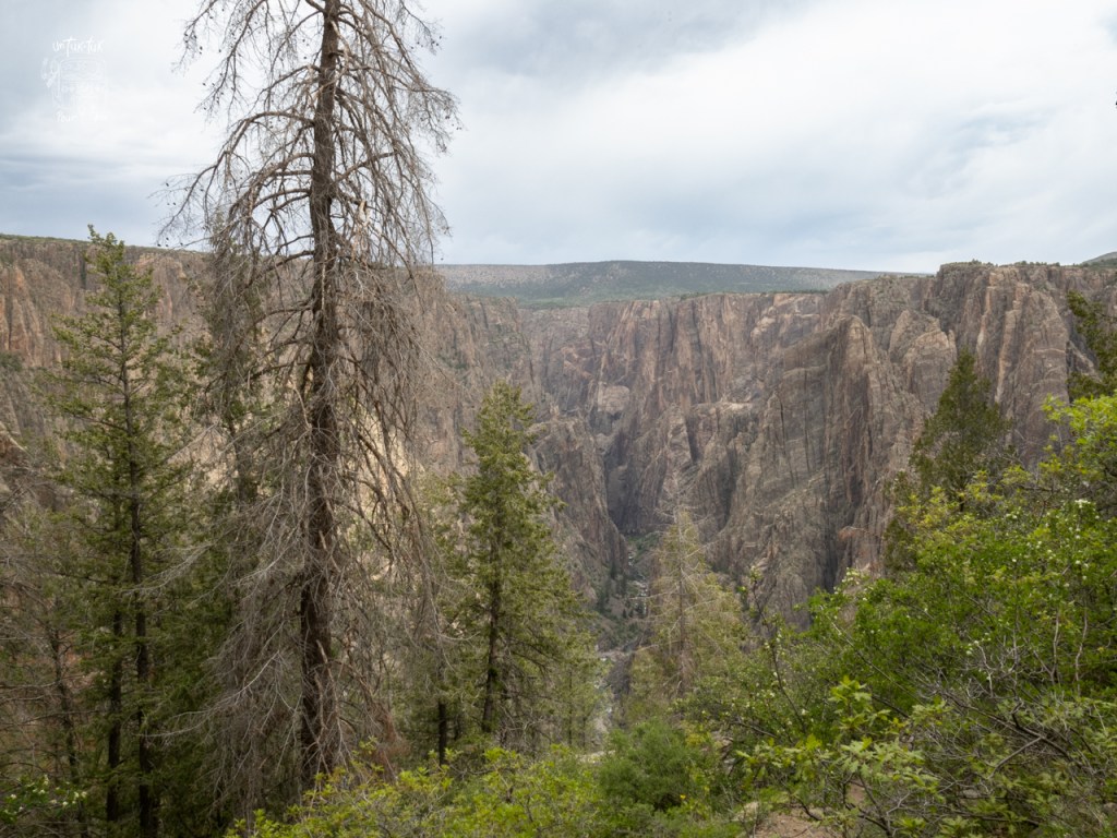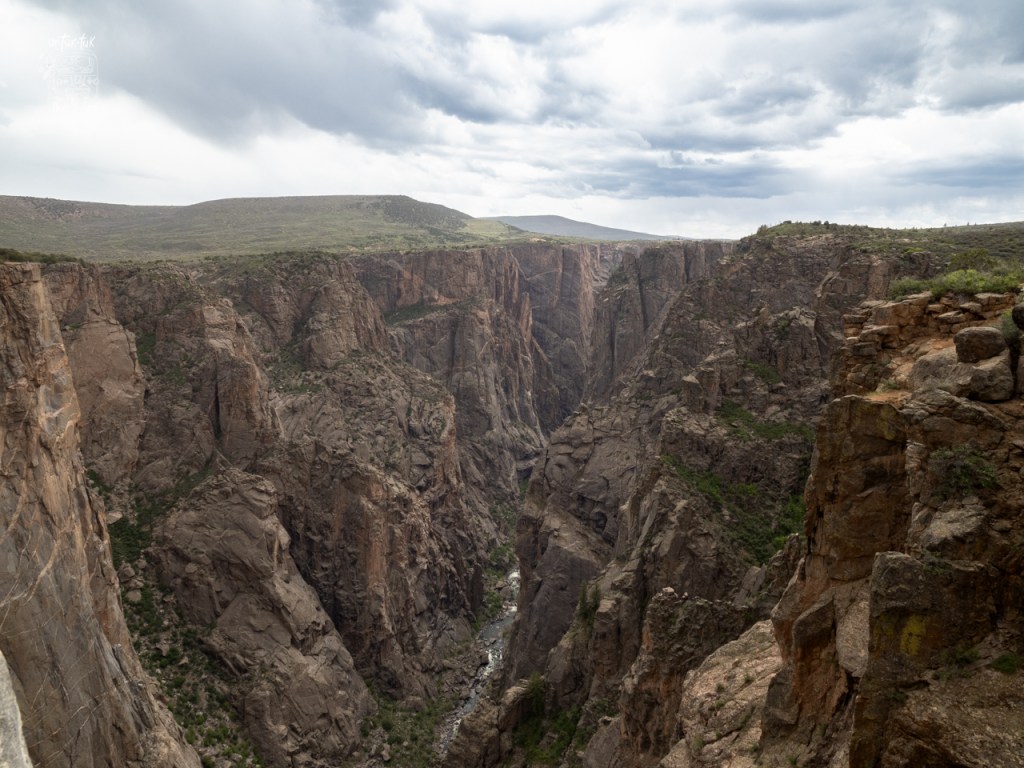 Après notre visite chez les cowboys, nous prenons la direction du «Canyon noir» de la rivière Gunnison, situé juste à côté de la ville de Montrose où on a dormi au Walmart le soir parce qu’il n’y avait plus de place dans le mini camping. En fait, oui il y avait bien une place dans le parc, mais trop petite pour notre tuk-tuk. Alors, nous revenons le lendemain matin pour sa découverte. Mais là, terminés les jaunes et ocres de l’Utah. Avec ses quelques 800 m de profondeur et son étroitesse par endroit, le canyon et ses tons de brun, noir et gris diffèrent des autres canyons, mais il impressionne autant. Il doit sa couleur foncée au gneiss et au schiste qui le composent. On se dit que l’enfer doit ressembler à ça un peu ;-).