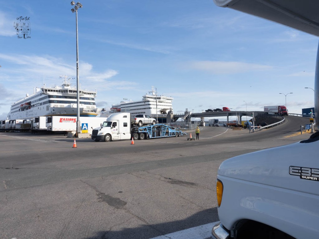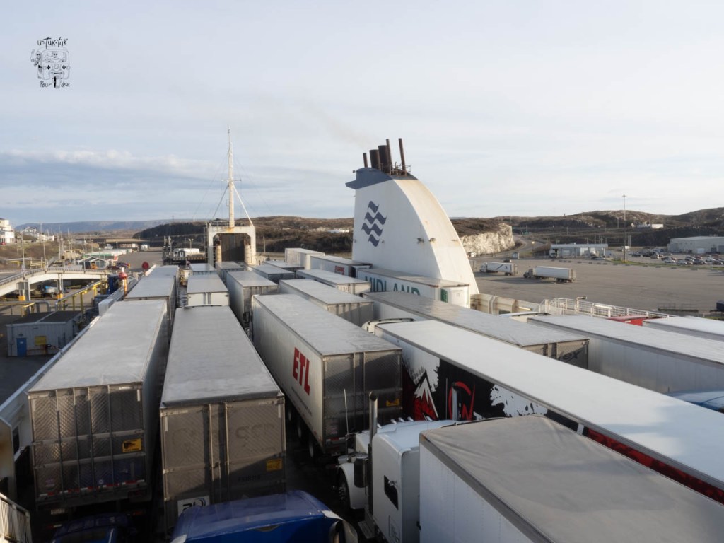 Nous arrivons à l’entrée du port de Marine Atlantique en fin d’après-midi, mais le départ n’est prévu que vers 23 h 15, donc plusieurs heures à patienter. On a droit au déchargement du bateau en fin d’après-midi et vers 19 h 30, le ballet du chargement des poids lourds débute. Des centaines de camions-remorques, avec ou sans les tracteurs, sont montés sur le bateau. C’est impressionnant de voir ça et surtout, divertissant, dans l’attente. Nous sommes aux premières loges, garés au début de notre file. Vers 22 h, les autos embarquent enfin, mais ça ne sera à notre tour que vers 23 h.