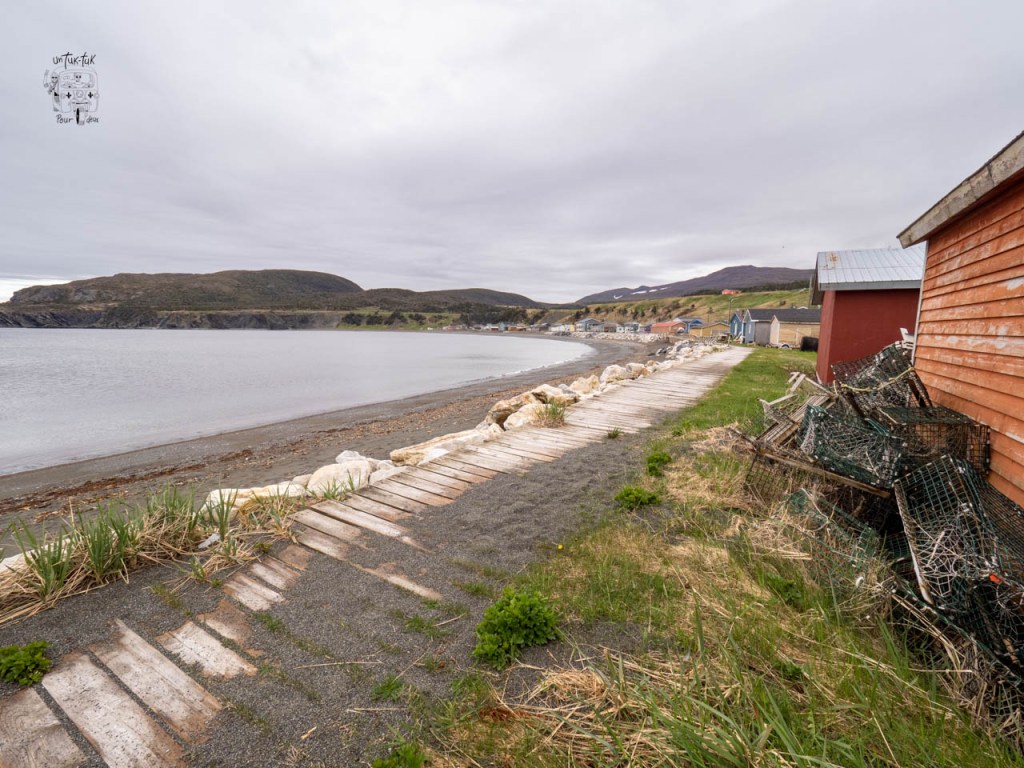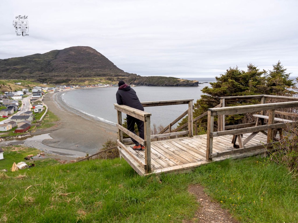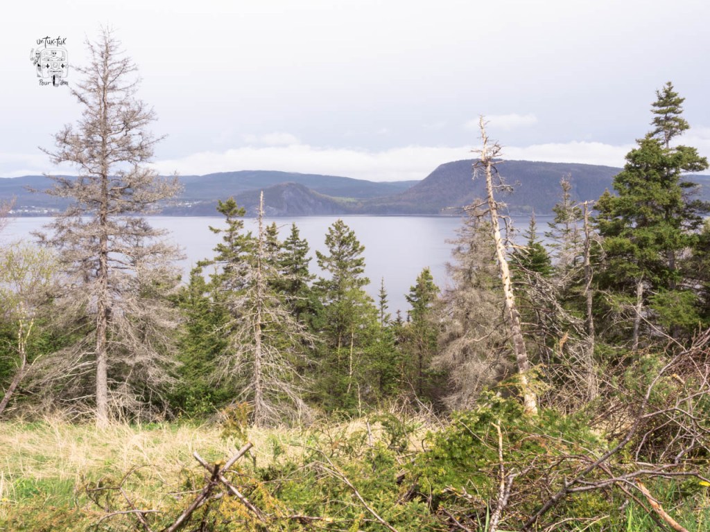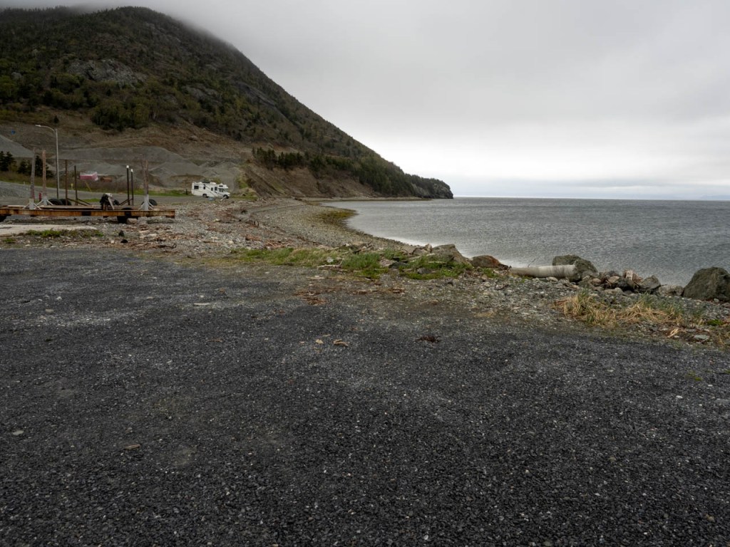 Comme troisième nuit dans le parc du Gros-Morne, c’est en plein centre de Trout River sur un terrain dégagé face à la mer que nous nous installons. Un léger dégagement au matin nous permet de marcher sur le trottoir de bois qui longe le village et de grimper au sentier en haut du cap accessible par un escalier situé après un petit pont. L’endroit offre une très belle vue… mais sans le soleil.