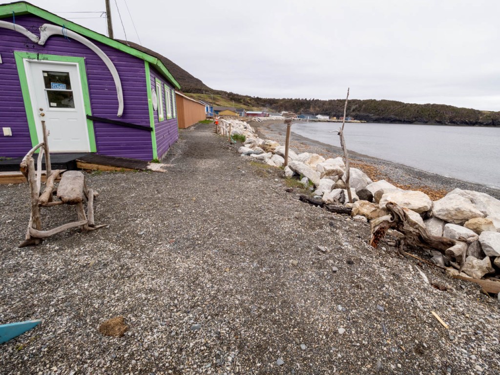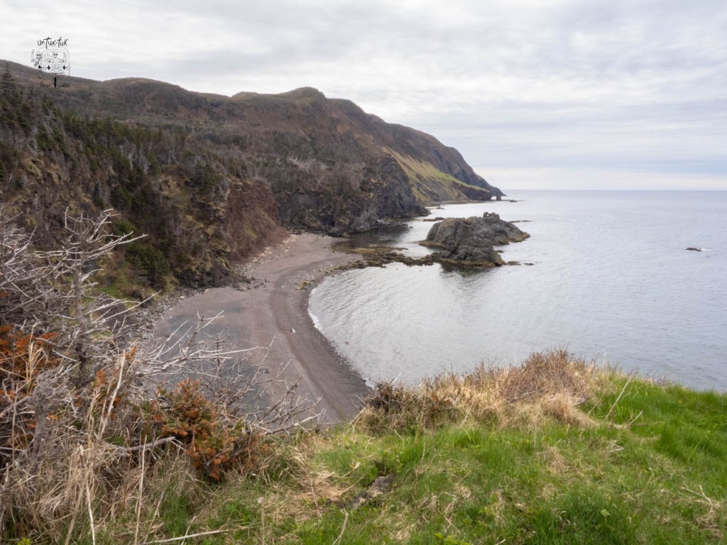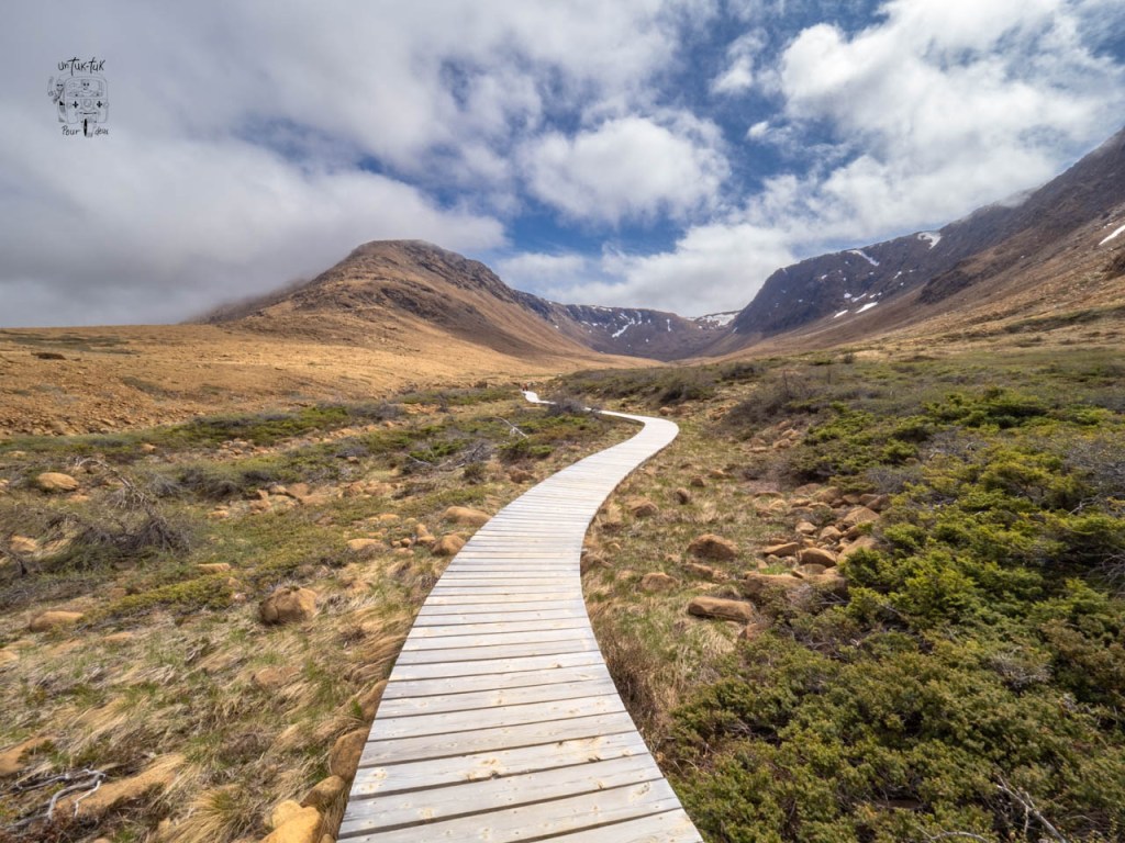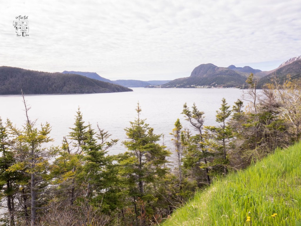 Comme troisième nuit dans le parc du Gros-Morne, c’est en plein centre de Trout River sur un terrain dégagé face à la mer que nous nous installons. Un léger dégagement au matin nous permet de marcher sur le trottoir de bois qui longe le village et de grimper au sentier en haut du cap accessible par un escalier situé après un petit pont. L’endroit offre une très belle vue… mais sans le soleil.