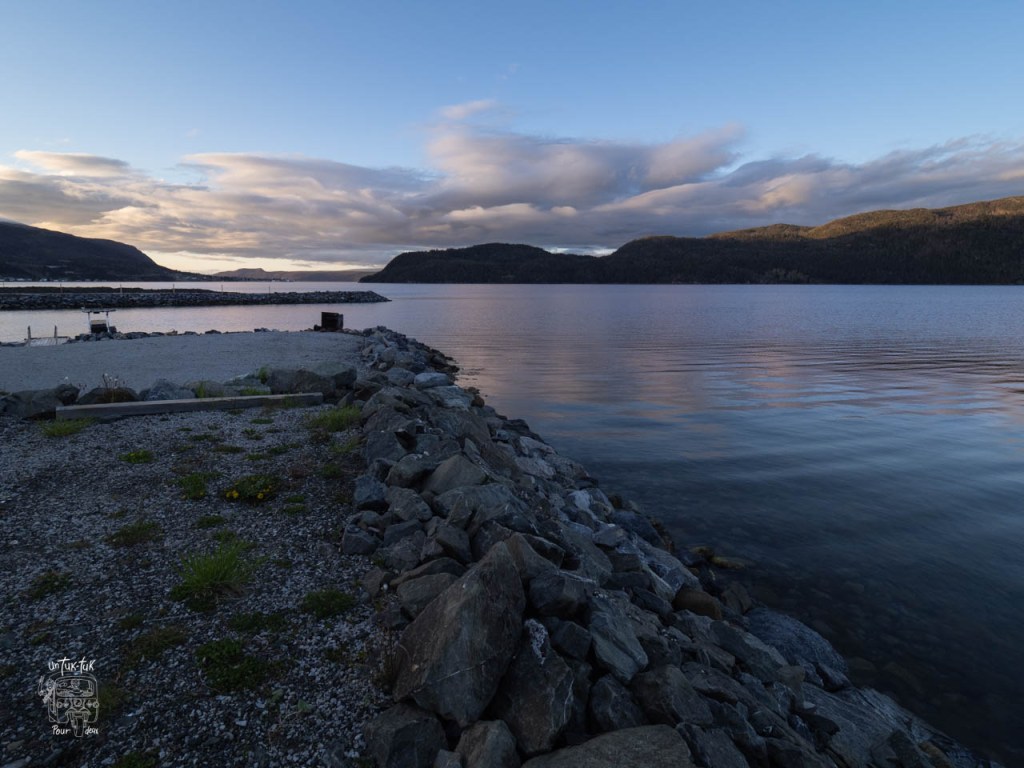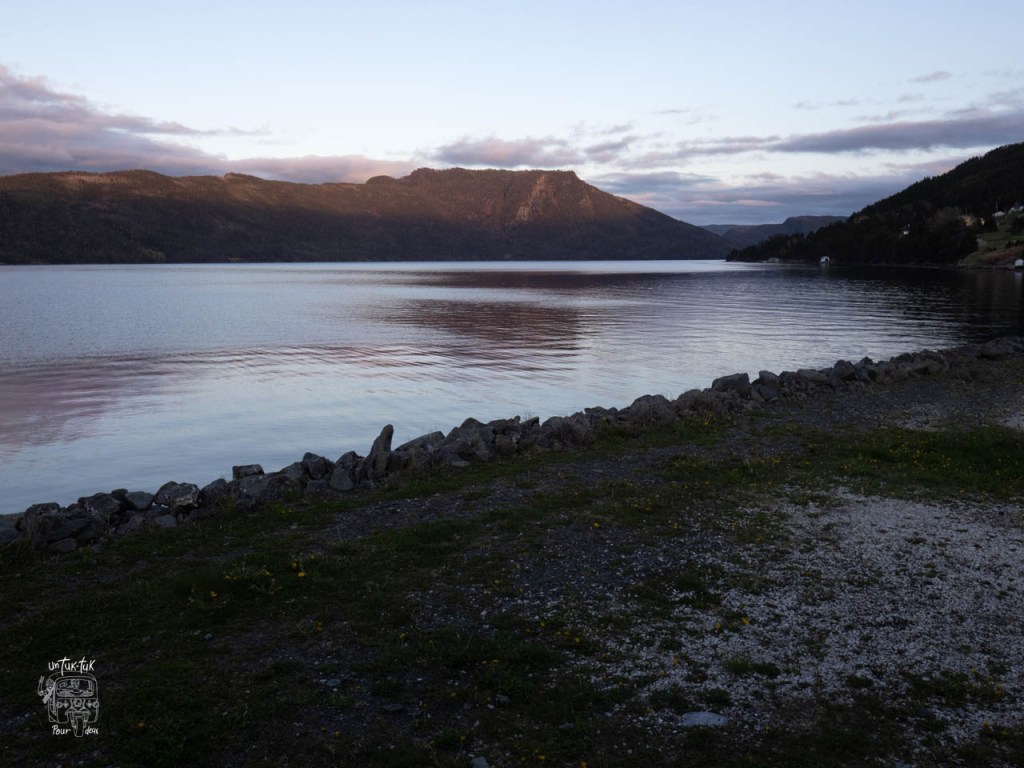 On fait dodo dans un camping (avec électricité pour faire le plein d’énergie) très bien situé à Baileys Point longeant Bonne Bay. C’est vraiment un beau spot avec en prime, des baleines en spectacle à nos pieds (si la chance nous sourit!). À notre arrivée, la première chose que nous dit notre voisin, « Bienvenue chers Québécois à l’observation de baleines ». Il parait qu’il y en a depuis quelques jours qui viennent se nourrir juste devant à l’heure du souper. Ha oui ! On aime ça. Finalement, pas de cétacés, mais des salutations d’un beau petit phoque au couchant du soleil.