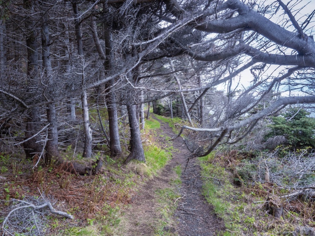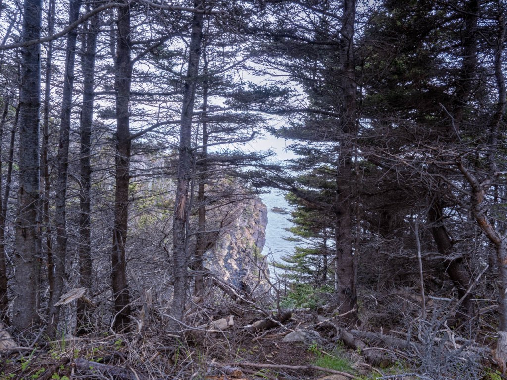 Après avoir mangé une bouchée, c’est le sentier Green Gardens (9 km a. — r.) de l’autre côté de la pointe que nous parcourons. Mais après quelques kilomètres dans des Tablelands bien dégagés, le paysage change. On commence à descendre dans une forêt plus ou moins dense de petits arbres tordus, ces fameux tuckamores, dans une première vallée, et ensuite on remonte puis on redescend près de la côte. Peut-être étions-nous fatigués par cette deuxième randonnée, mais une promenade dans le bois, sans vraiment de points de vue sur l’océan n’était pas gagnant de l’avis de Jean-Pierre. De celui de Dominique par contre, ce sentier qui traverse différents types de terrain et de végétation et qui se termine sur un cap avec accès à une plage était extra. Même avec une fin plus que venteuse accompagnée de quelques gouttes de pluie!