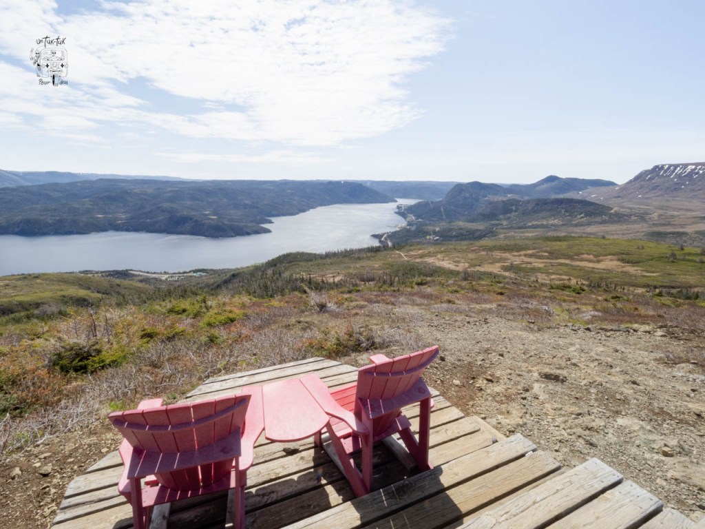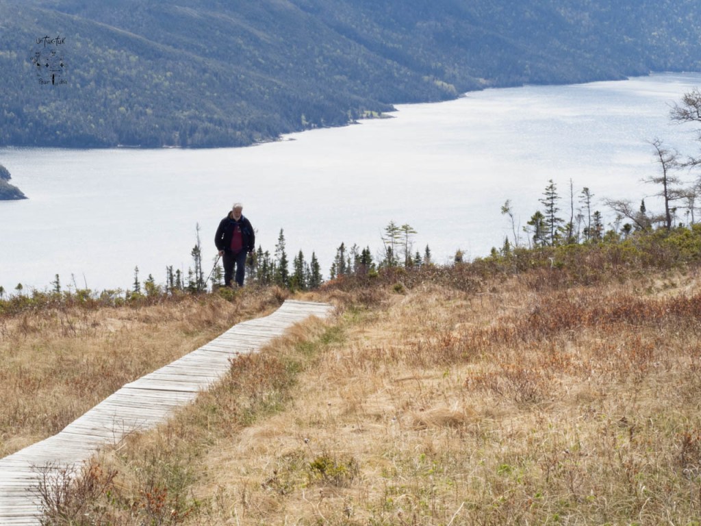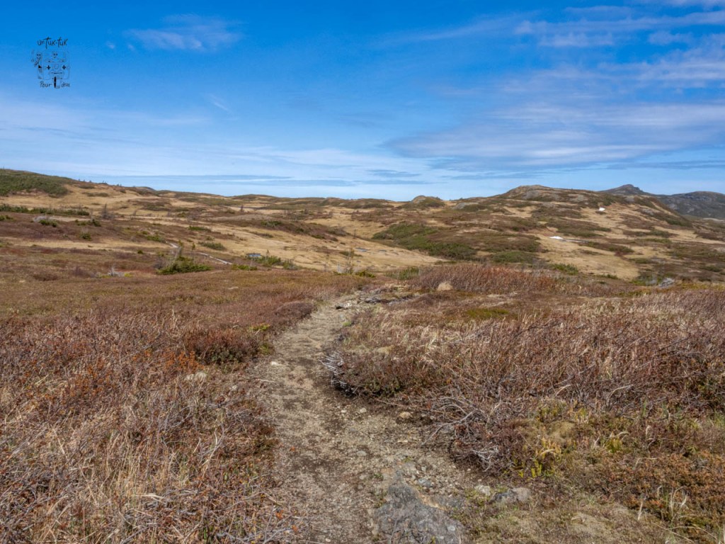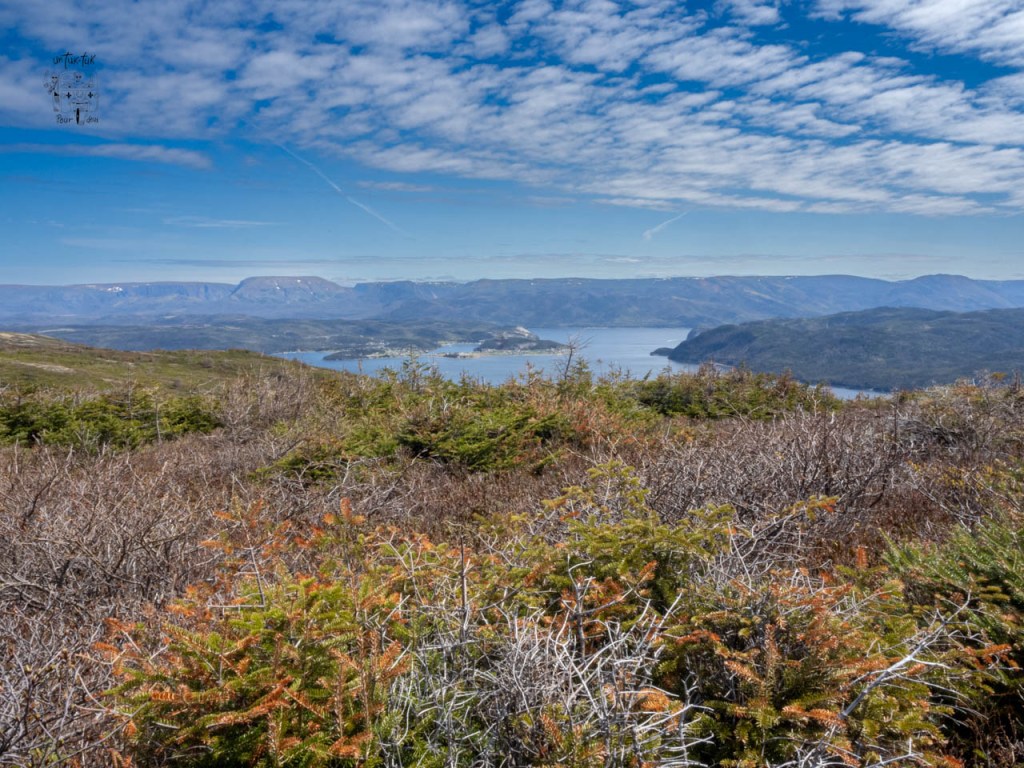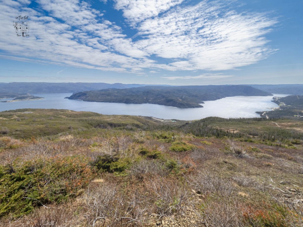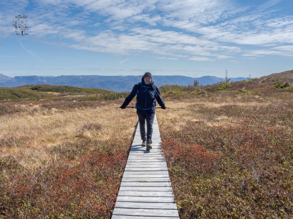Le lendemain matin au petit-déj. Dominique demande d’ouvrir le rideau de devant « Des fois qu’il y aurait des baleines qui passeraient ». Hé bien, youhou ! Timing parfait ! Une baleine (un rorqual commun probablement), juste sous nos yeux. Faut nous croire sur parole, pas le temps pour une photo. La belle température toujours au rendez-vous, nous attaquons le magnifique Lookout (5 km a. — r.) situé juste à l’arrière du Centre de découvertes. Ce sentier de niveau modéré offre des vues imprenables du sommet de Patridgeberry Hill, sur Bonne Bay, Norris Point, le mont Gros-Morne et les Tablelands. À ne pas manquer !