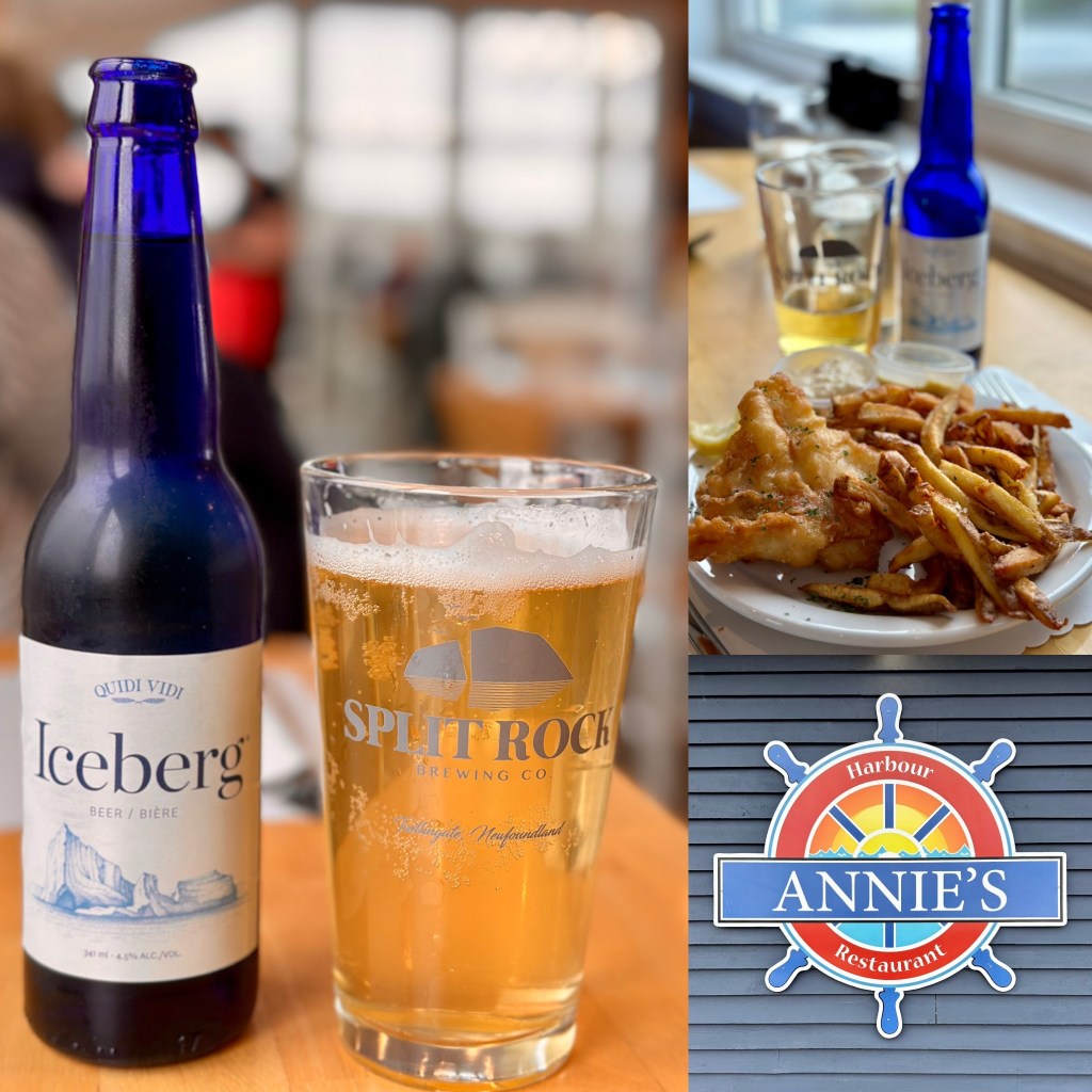 Le lendemain, pluie et pluie de telle sorte que nous faisons plus d’ordi que de plein air. Et, il fallait bien s’en douter, les batteries se vident doucement, mais sûrement. Pas le choix, nous nous trouvons un camping proche pour recharger le tout. Une éclaircie en fin d’après-midi, yé ! On en profite pour une première sortie. Une marche d’à peine 2 km pour aller souper au restaurant Annie’s situé à deux pas de la halte routière où nous étions la veille. Fish & Chips pour Dominique et morue pour Jean-Pierre avec une Iceberg. Non, non ce n’est pas parce qu’on est en manque de voir des icebergs — vous aurez compris qu’il n’y a aucun iceberg en vue dans la capitale — c’est le nom de la bière brassée à Quidi Vidi, près de St. John’s. Le secret de son bon goût ? Elle est composée, supposément, d’eau provenant d’un vrai glacier de plus de 20 000 ans… En tout cas, tout était délicieux. On vous recommande le tout, le restaurant… et bien entendu, la bière. Et on enfile à nouveau nos manteaux (première couche et coquille), notre bonnet et nos gants pour retourner à notre camping. C’est le ventre bien plein que nous nous endormons et rêvons que le soleil brillera de mille feux au matin ;-).