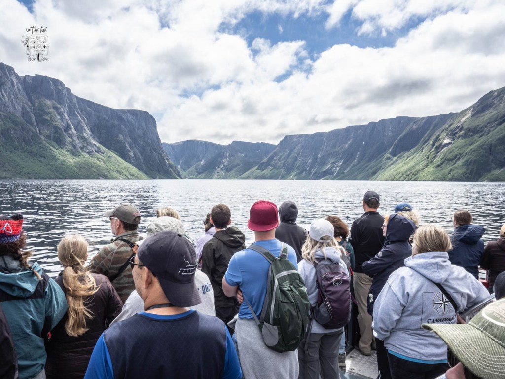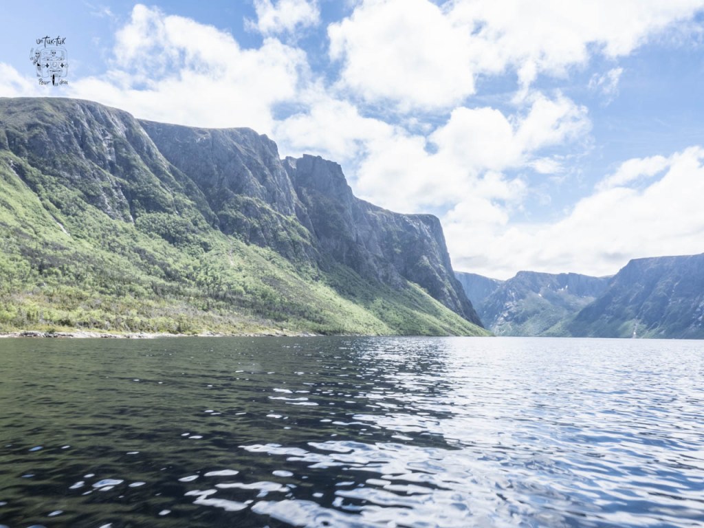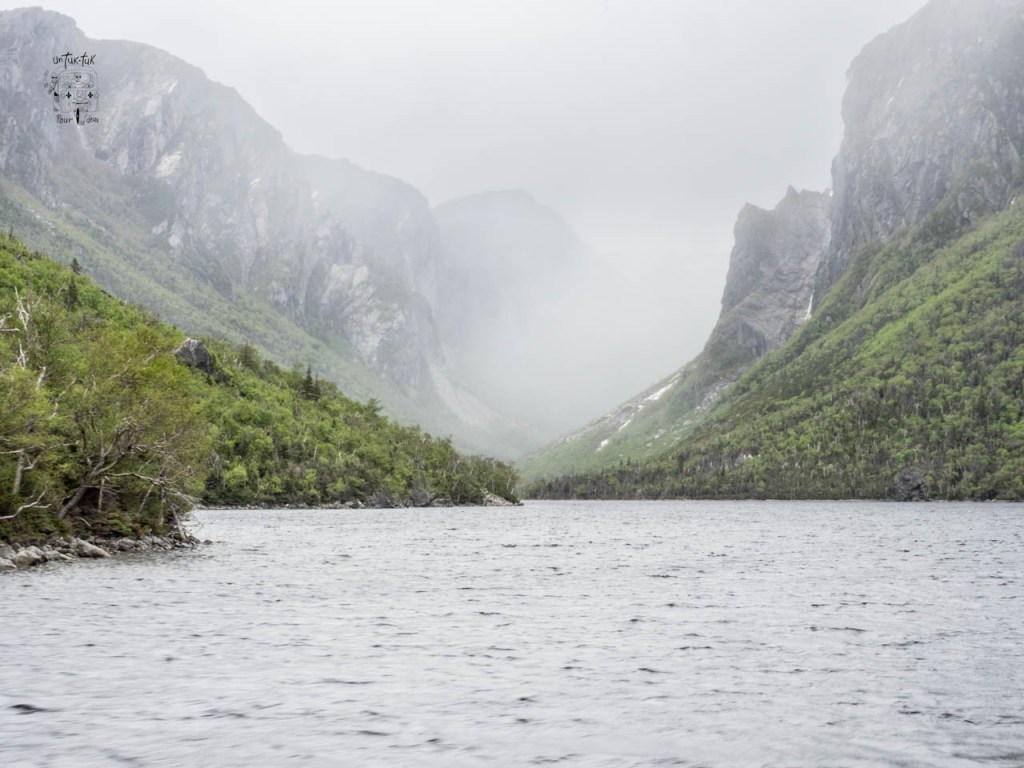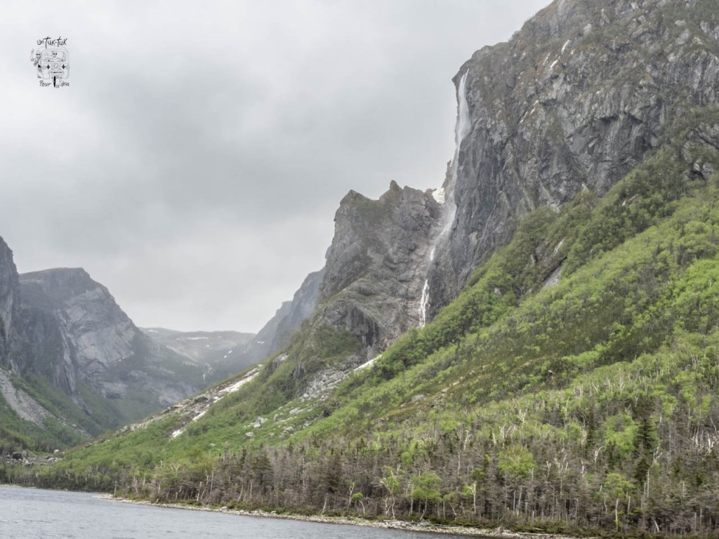 Ensuite, c’est une croisière de deux heures qui nous amène au fin fond du lac entre des falaises de granit de près de 700 m. de haut de chaque côté. À Terre-Neuve, ils appellent ça un étang, mais c’est plutôt un lac de 16 km de long et de 165 m. de profond. Et, à bien y voir, de visu ou sur une carte, il est évident que ce fjord a déjà été un glacier qui s’est frayé un chemin vers la mer.