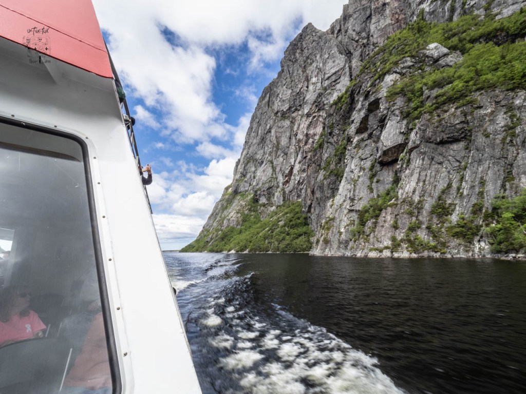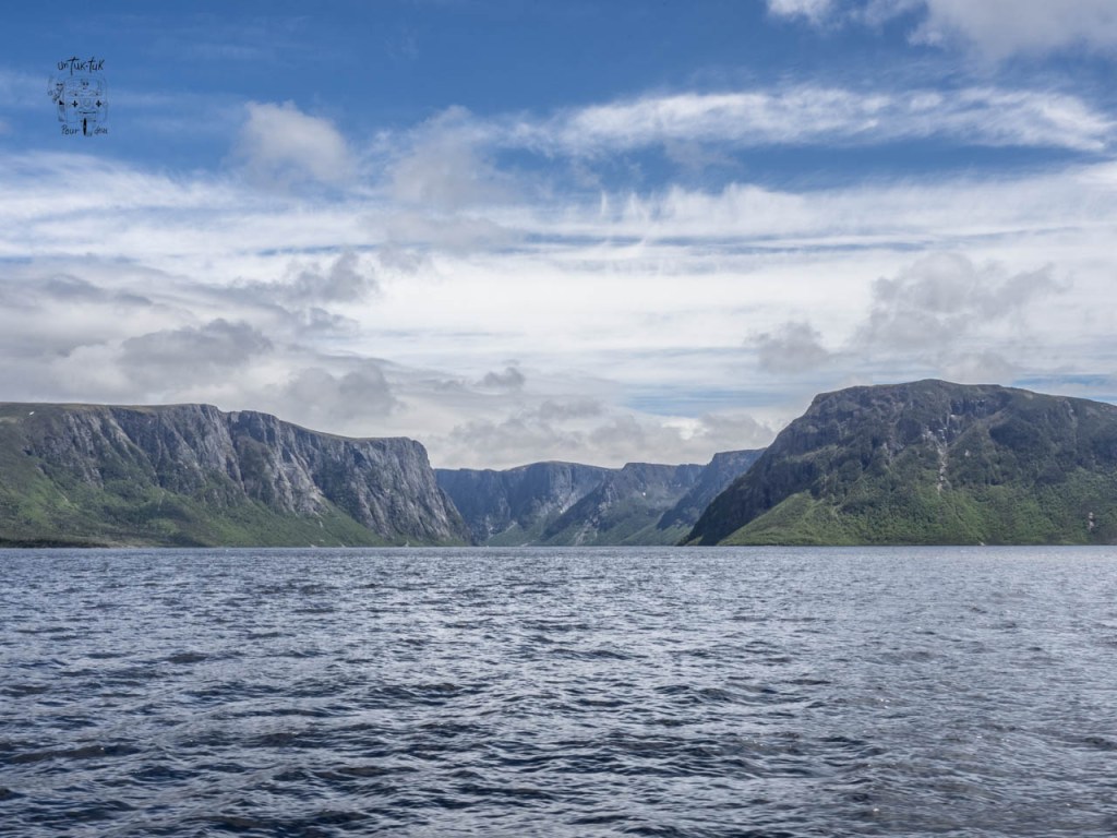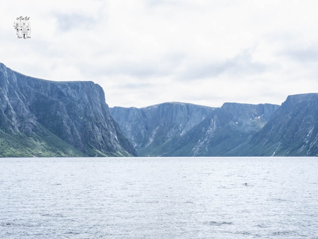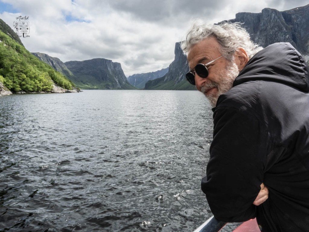 Ensuite, c’est une croisière de deux heures qui nous amène au fin fond du lac entre des falaises de granit de près de 700 m. de haut de chaque côté. À Terre-Neuve, ils appellent ça un étang, mais c’est plutôt un lac de 16 km de long et de 165 m. de profond. Et, à bien y voir, de visu ou sur une carte, il est évident que ce fjord a déjà été un glacier qui s’est frayé un chemin vers la mer.
