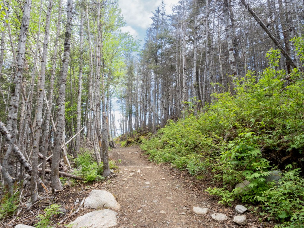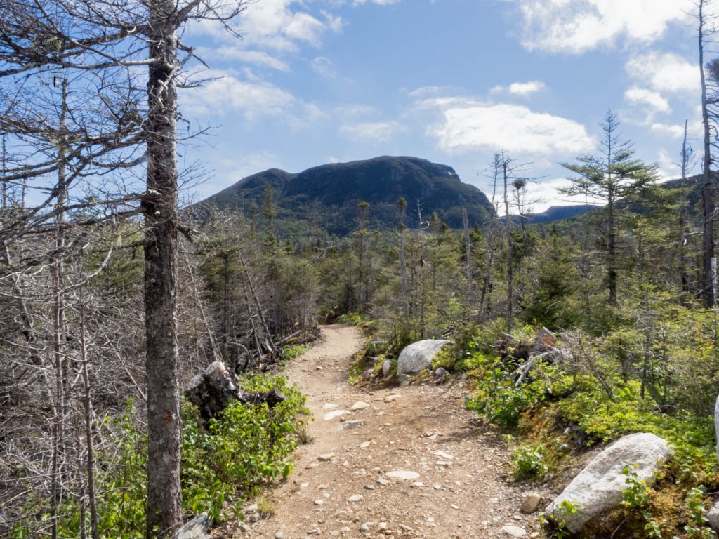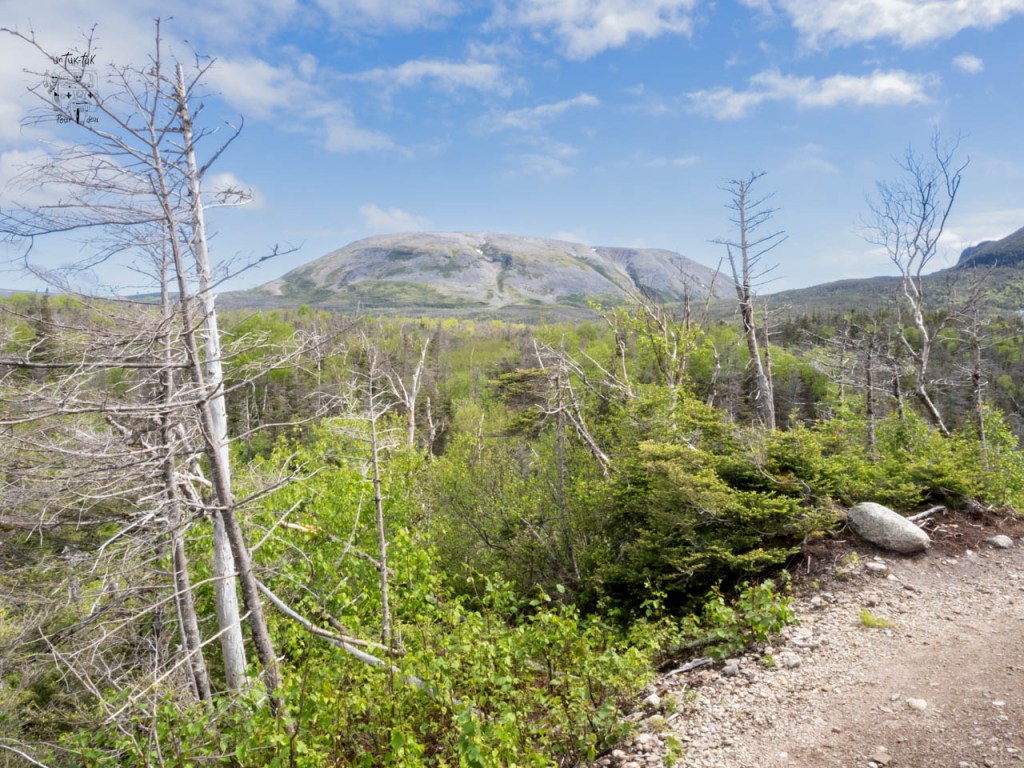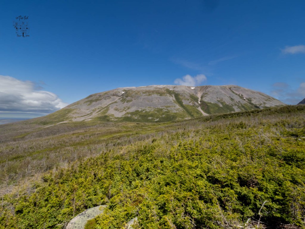 Lundi, enfin, nous attaquons le sentier d’approche du Mont Gros-Morne, environ 9 km a.— r. de catégorie modérée. En grande partie dans le bois, il offre peu de beaux points de vue, excepté dans les derniers 500 m. En effet, en haut, nous nous retrouvons sur un plateau avec des arbustes de 5 à 8 pieds de hauteur d’où nous profitons d’une splendide vue sur les montagnes environnantes et surtout sur le mont Gros-Morne à proximité. Bien déçus de ne pouvoir y monter…