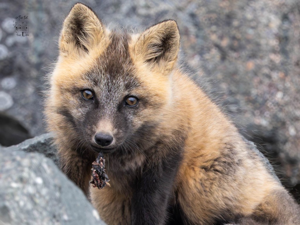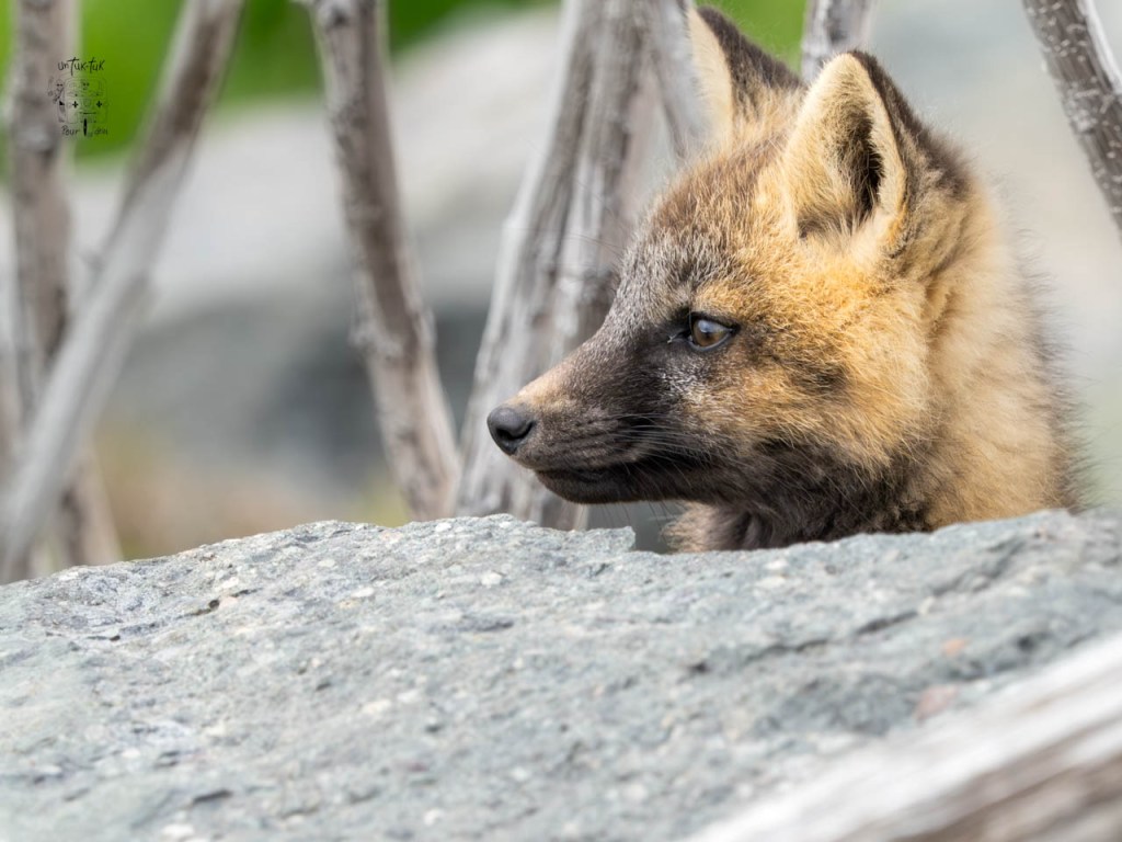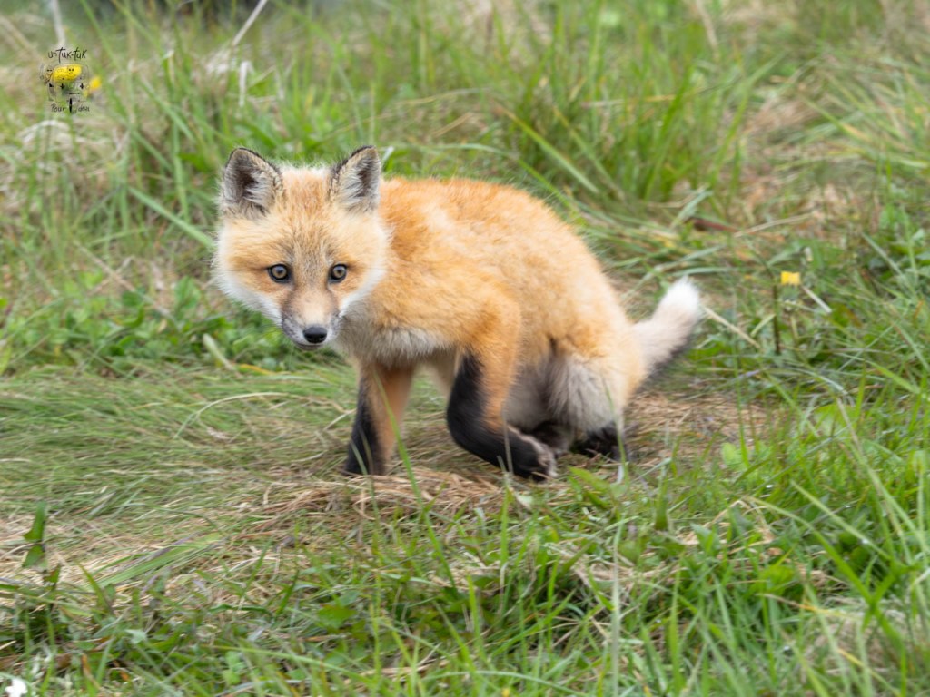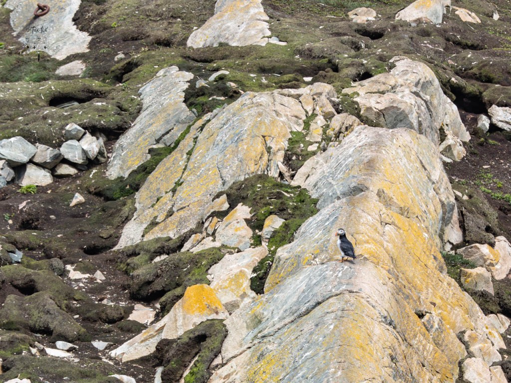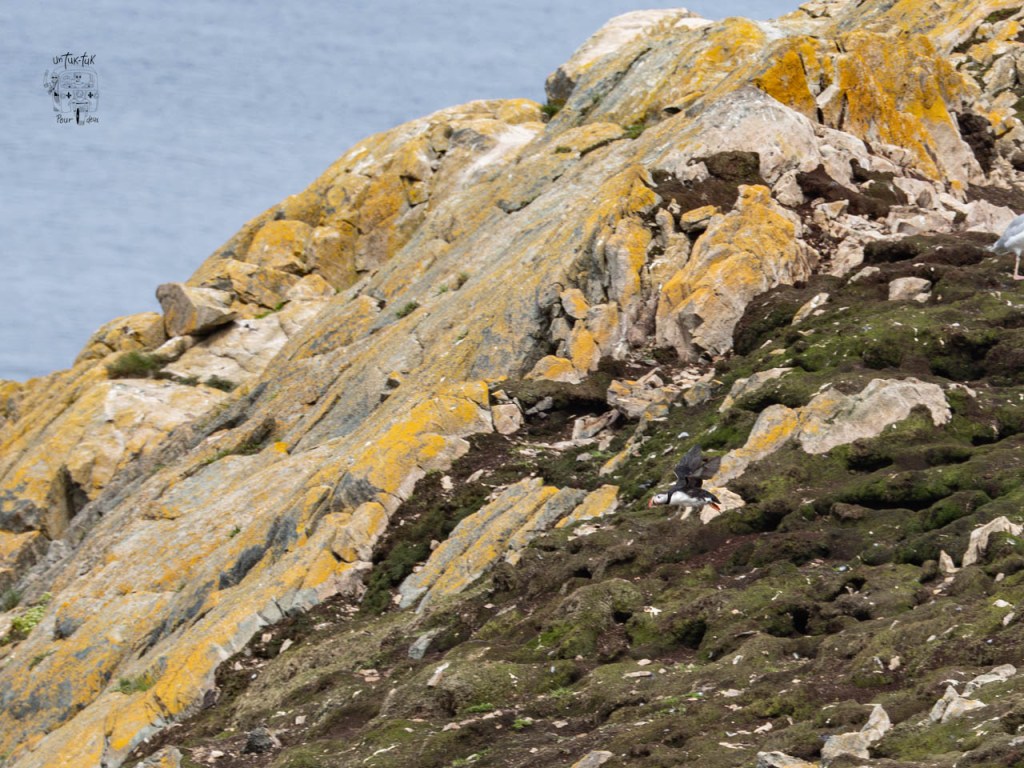 En allant marcher autour, nous remarquons un renardeau, pas peureux du tout, qui se prélasse devant son terrier. Une photographe bien installée face à lui nous explique qu’ils sont trois dans la fratrie de l’année. Elle les photographie depuis leur naissance et nous apprend que la mère chasse durant la journée et que plus farouche que ses descendants, elle ne reviendra que plus tard, lorsqu’il n’y aura plus de gens tout près. Nous l’apercevons d’ailleurs courir au loin. Les petits sont si mignons et divertissants que ça compense presque l’absence des macareux.