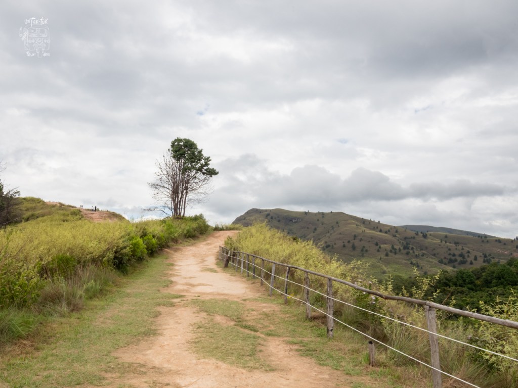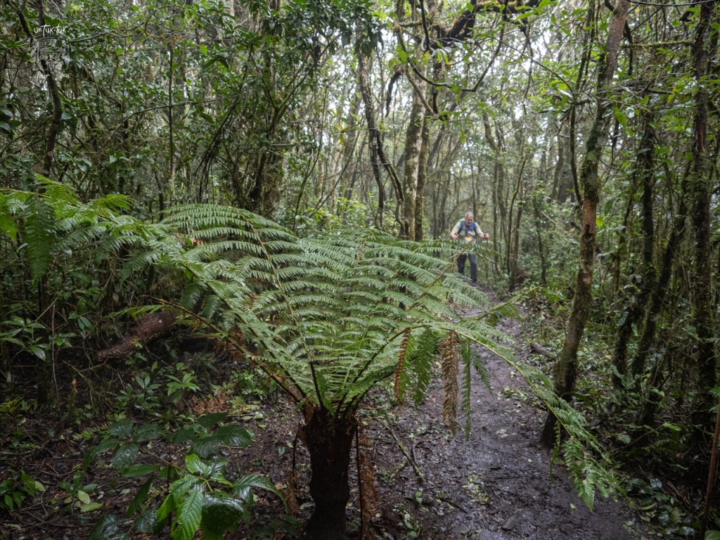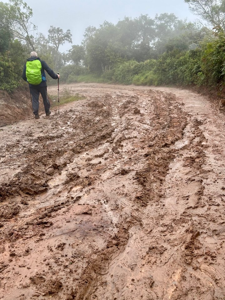Nous nous engouffrons dans la jeep et commençons la montée de la montagne. 45 minutes sont prévues. À environ un kilomètre de l’entrée du parc, le véhicule ne peut plus grimper en raison de la route vaseuse à souhait et creusée d’ornières. Il faut dire que, dans la région du moins, le sol est constitué d’argile de couleur ocre qui, mouillée, se transforme rapidement en boue glaiseuse très très glissante.