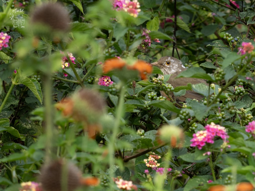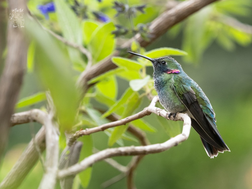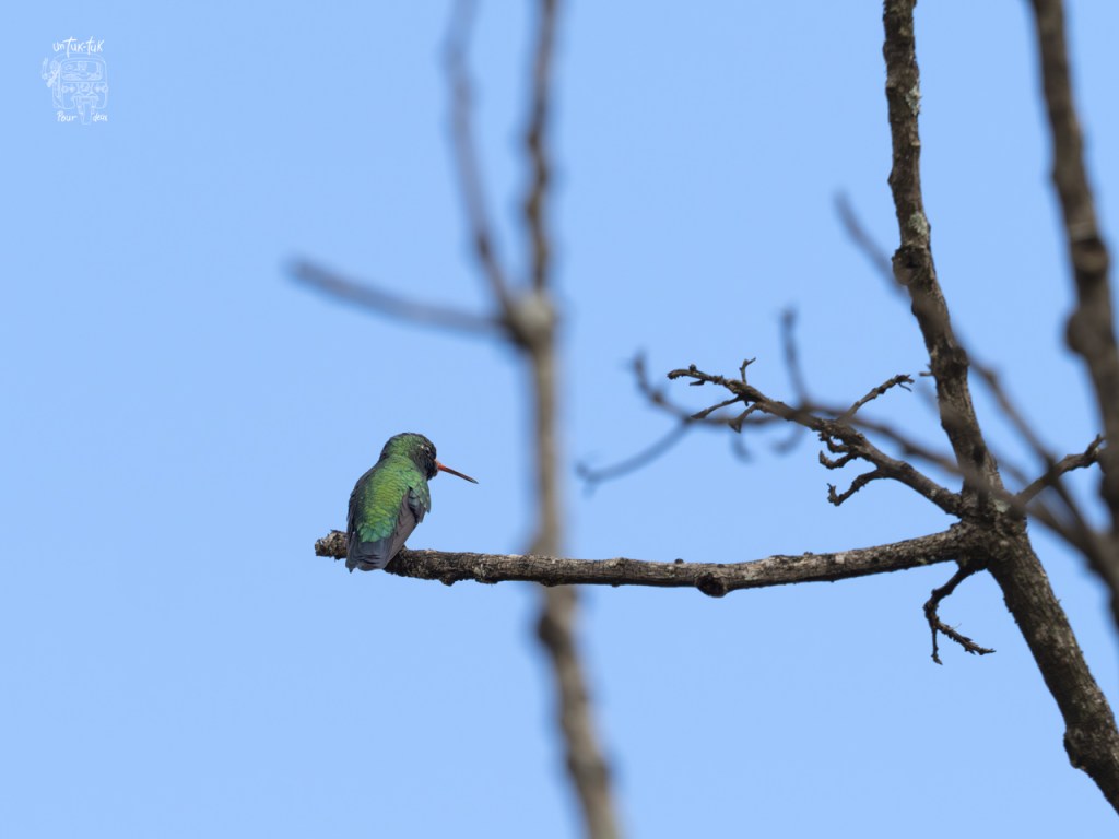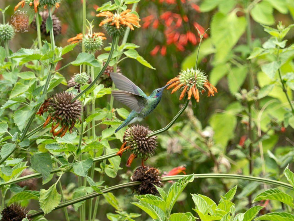 Le couple proprio a aménagé son terrain avec beaucoup de fleurs différentes, d’arbustes et plusieurs mangeoires pour les colibris. Selon la dame, plus d’une vingtaine d’espèces fréquentent l’endroit en fonction des saisons et des floraisons. C’est spectaculaire pour nous Québécois qui n’accueillont que celui à gorge rubis dans nos régions. En plus des petits sentiers, il y a trois postes d’observations. Nous avons pu observer cinq variété de colibris, malheureusement Dominique n’a pu capter celle avec la longue queue.