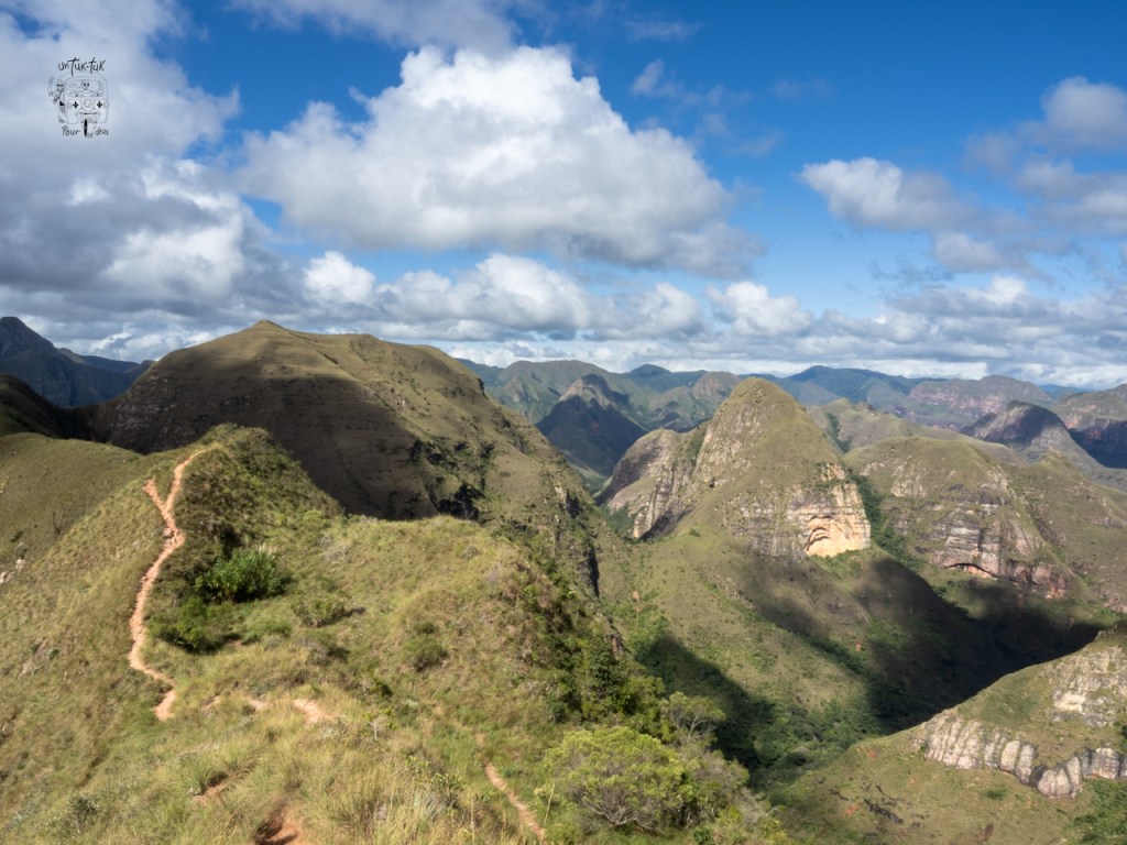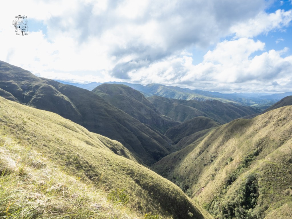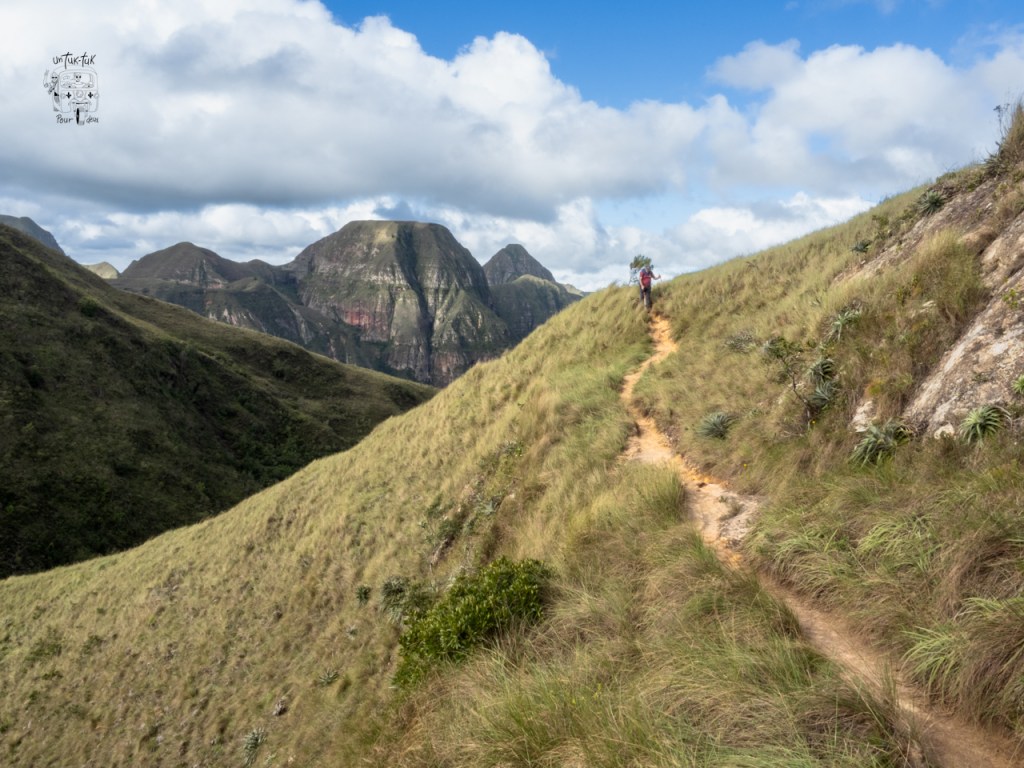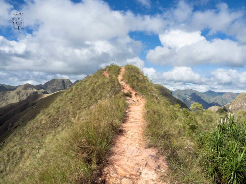 Puis, nous arrivons à la crête des montagnes. Nous pouvons suivre aisément le sentier pendant une trentaine de minutes. À certains endroits par contre, le sentier est si étroit et près de précipices qu’il peut s’avérer difficile pour ceux souffrant de vertige. Dominique en ayant été prévenue par Sophie (emmeneznousauboutdelaterre) et s’était si bien préparée mentalement à traverser ce handicap qu’au final, elle n’a presque pas ressenti de mauvais feeling. Faut dire qu’il n’y ventait pratiquement pas. Merci Sophie !