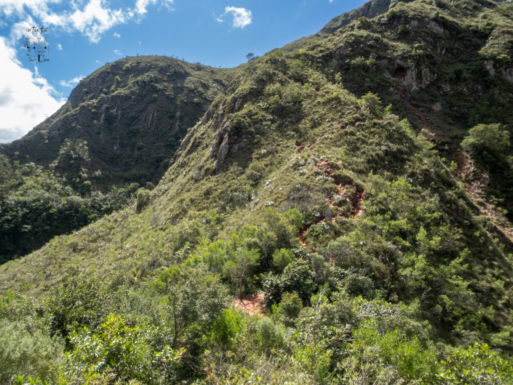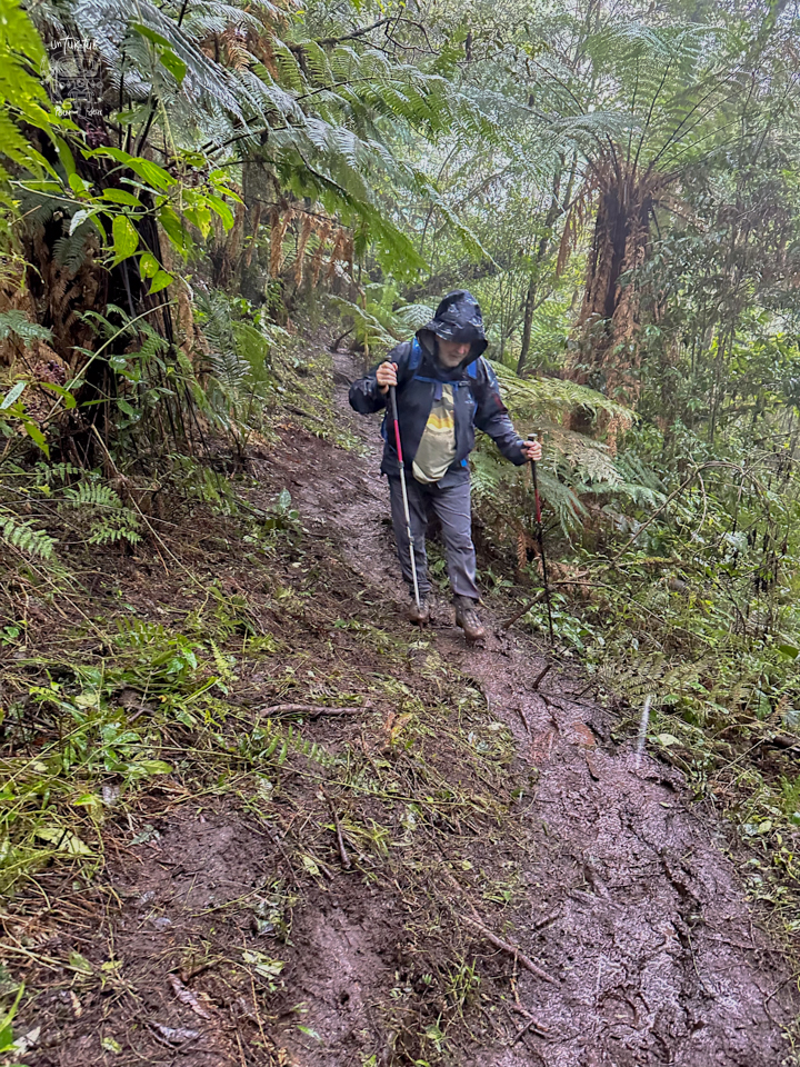 Quant au sentier, ça monte raisonnablement pendant environ 30 minutes. Ensuite, ça se corse et grimpe assez abruptement pendant 45 minutes par un sentier qui ressemble à une ravine. Il est très étroit pourvu de rocher parfois assez gros que nous devons nous aider de nos mains.