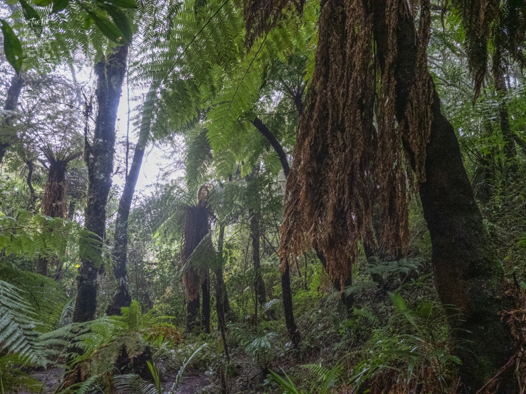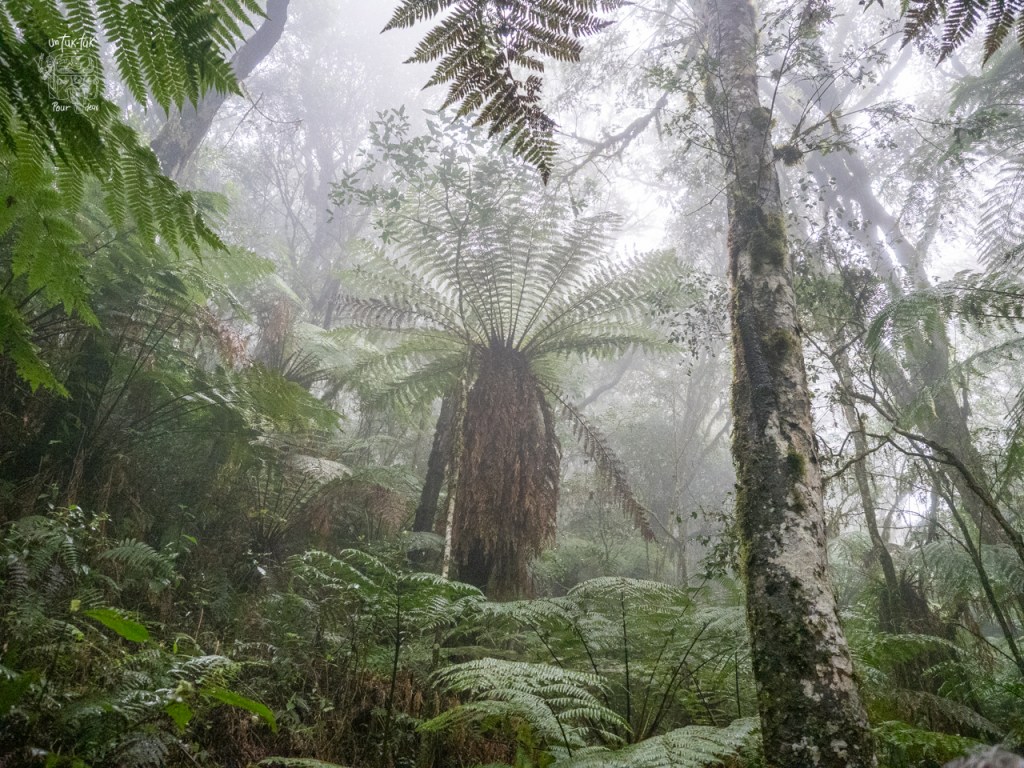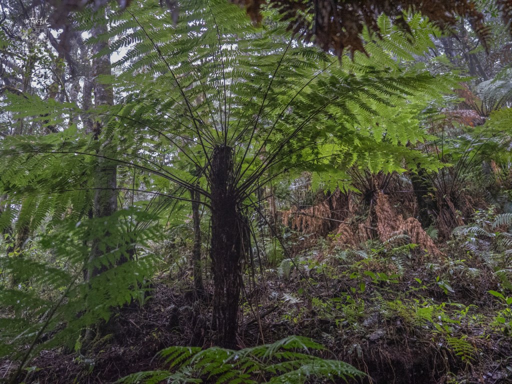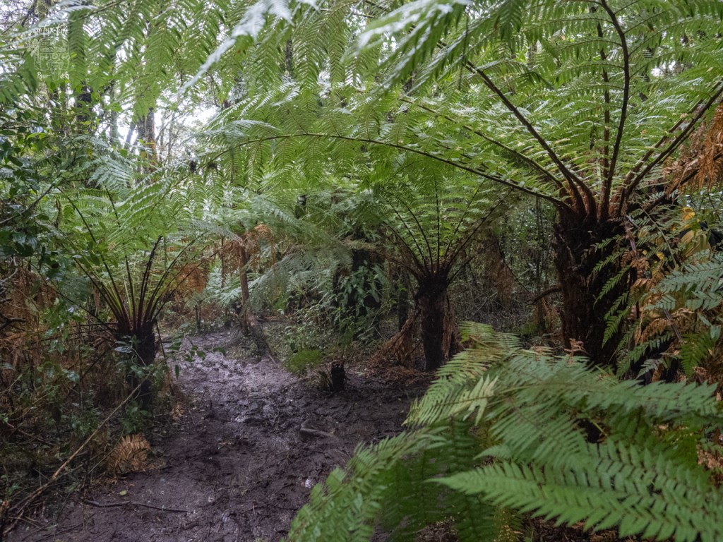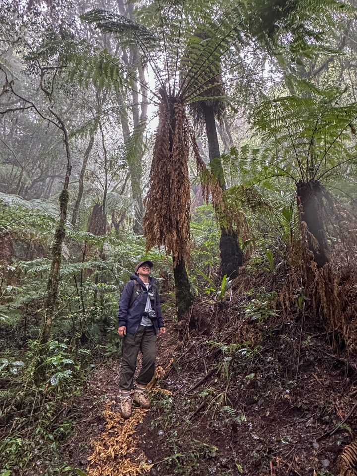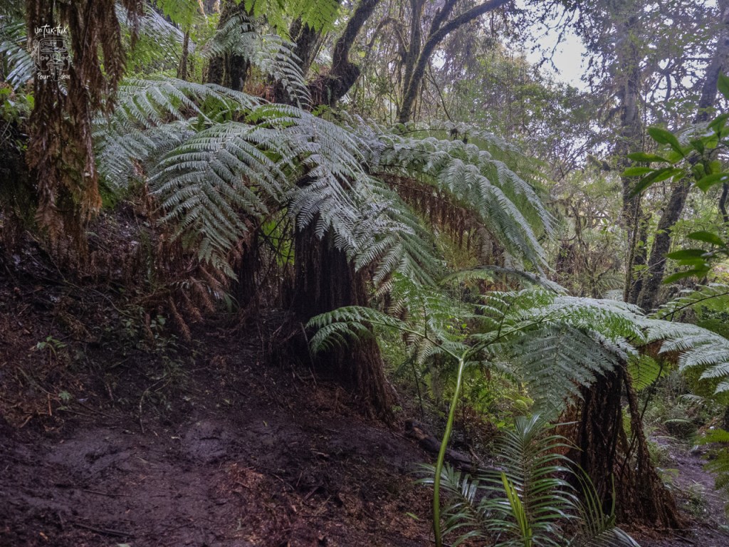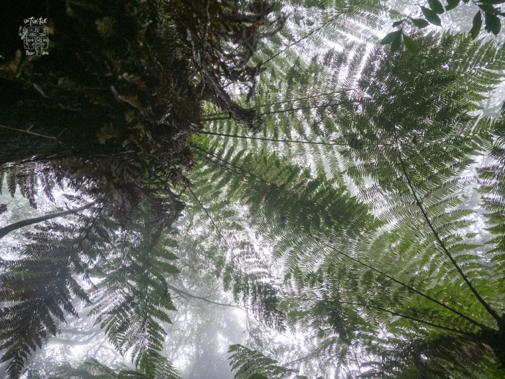 Donc, nous devons poursuivre à pied. Mais l’Allemand, mesurant plus de six pieds, mal chaussé pour l’activité et encore moins équipé de bâtons de marche, se plante royalement à genoux dans la vase à quelques reprises. Pas trop de bonne humeur, le monsieur ! Ses jeans sont pleins de boue et la randonnée n’est même pas débutée à proprement parlé. Ouf ! Nous arrivons finalement au parc, le sentier est classé intermédiaire, mais est déjà vaseux à notre arrivée et il commence à pleuvoir solidement. Notre guide est bien encourageant et il connaît bien le parc et ses plantes. Après environ une heure de marche en forêt, nous parvenons « enfin » au but de cette randonnée, les Helechos Gigantes, des fougères géantes dont certaines atteignent 4 m de hauteur. C’est énorme pour ce genre de plante, mais ce qui impressionne le plus, c’est que celles-ci ne poussent que de un centimètre par année. Nous sommes donc admiratifs devant des spécimens de plus de 400 ans. C’est fou ! Selon le guide, cette famille de fougères existerait depuis des milliers d’années.