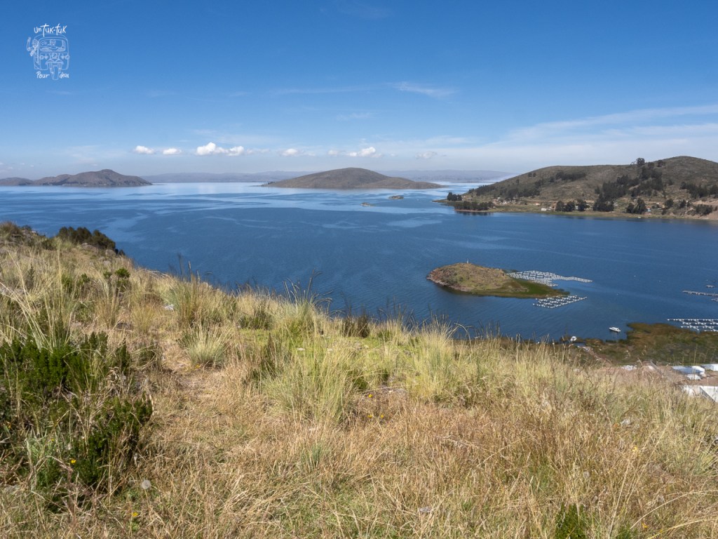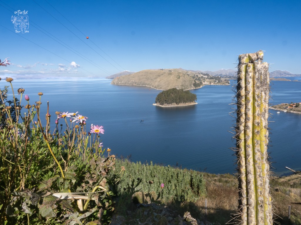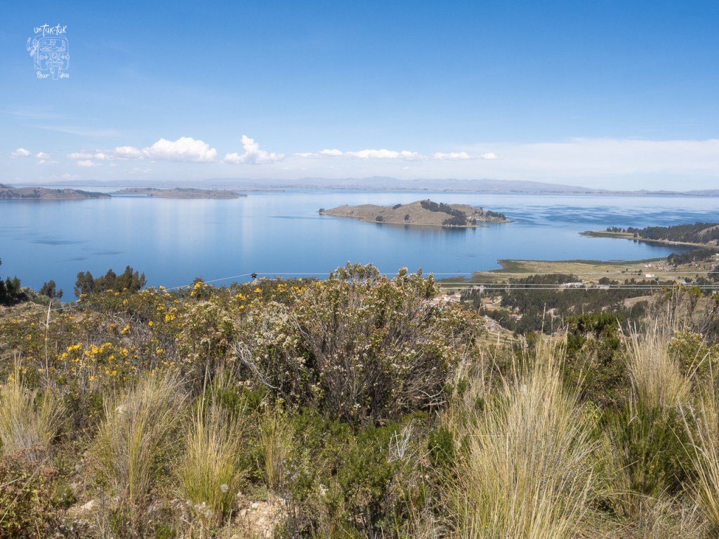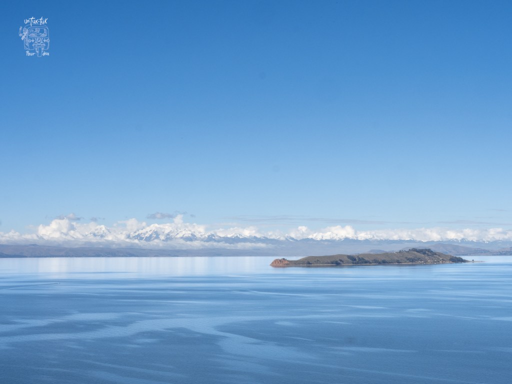 Après trois heures de route — 140 km —, le fameux lac Titicaca et ses rives apparaissent au loin. Immense, il mesure environ 190 km de longueur par 80 km de largeur dont grosso modo 44 % de la superficie se situe en Bolivie et le reste au Pérou. Aussi, c’est le lac navigable le plus élevé au monde avec ses 3812 m d’altitude et le plus grand lac d’eau douce d’Amérique du Sud. Mais surtout, selon une légende, Manco Capac, le présumé fondateur de la dynastie inca, serait issu du lac Titicaca, notamment de la Isla del Sol, avant d’aller s’installer à Cuzco au Pérou.