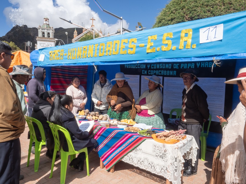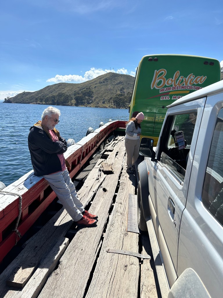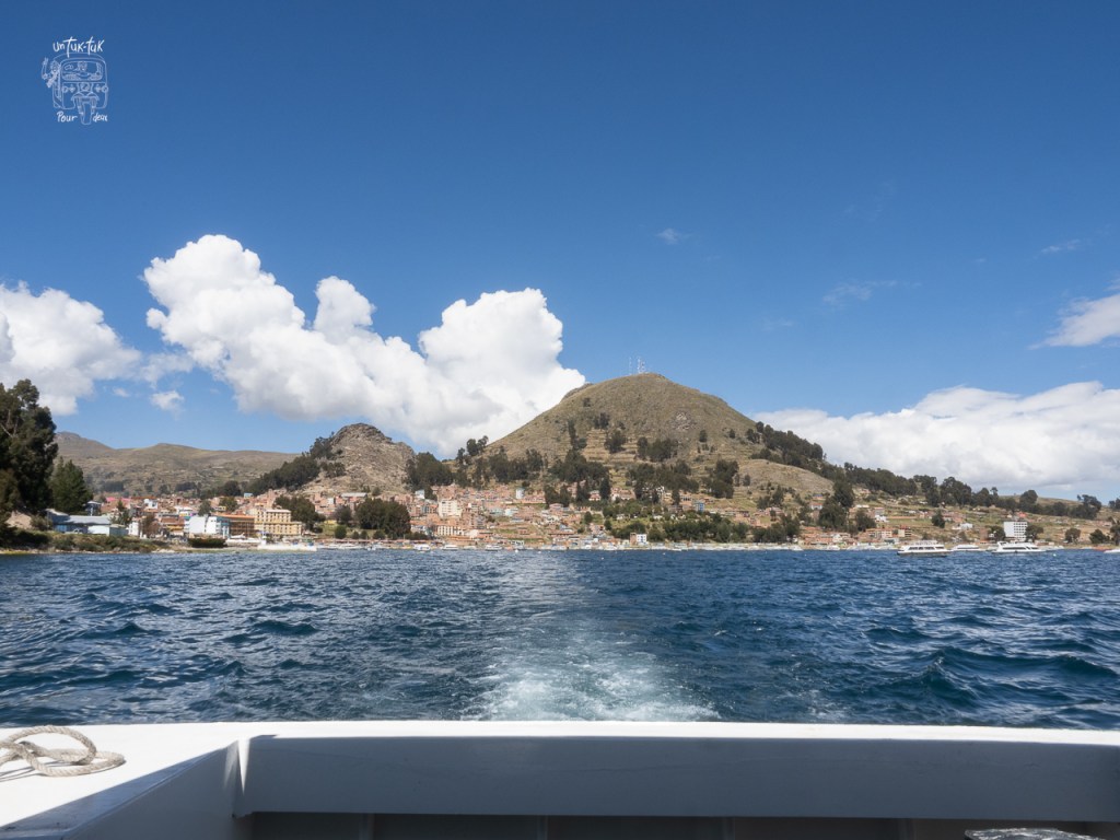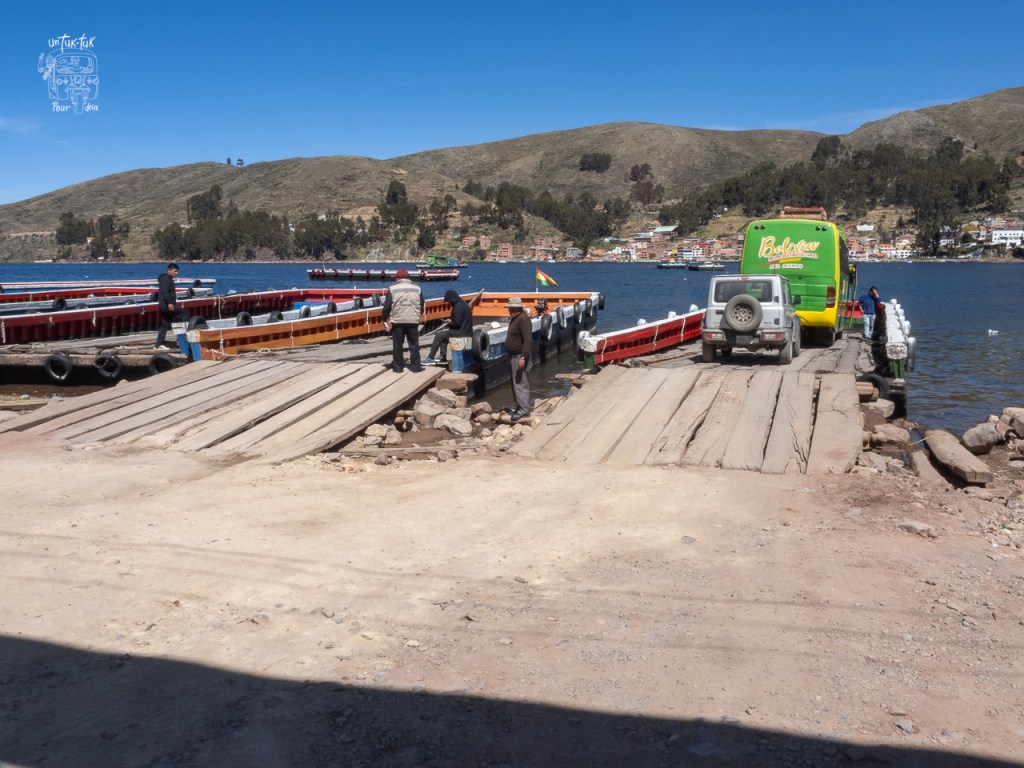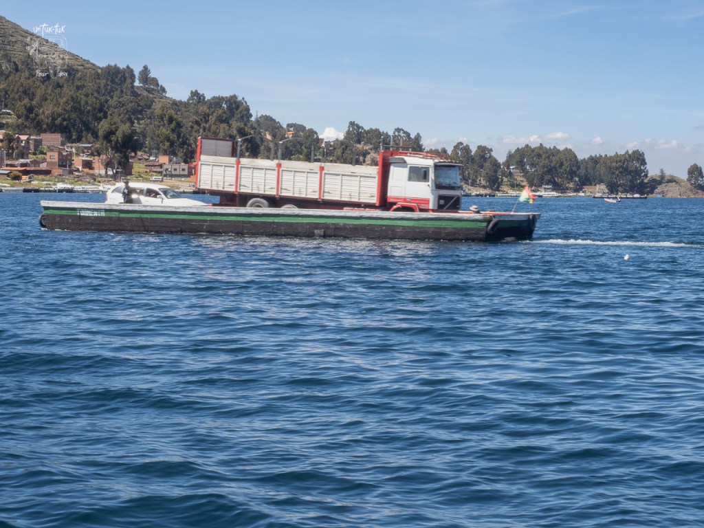 Quant à Copacabana, la ville est située dans une presqu’île dont la majorité de la superficie, ainsi que le lien terrestre appartiennent au Pérou. Pour les visiteurs de la Bolivie, il faut prendre un modeste traversier. C’est-à-dire un bac en bois qui contient deux véhicules seulement, un gros et un petit selon l’arrivage et qui est propulsé par un moteur hors-bord de 50 hp et un unique homme d’équipage. Il en coûte 47 bolivianos, soit environ 10 $CAN pour l’emprunter et les mesures de sécurité sont, disons, minimales. Mais bon, ça nous traverse le chenal en une quinzaine de minutes.