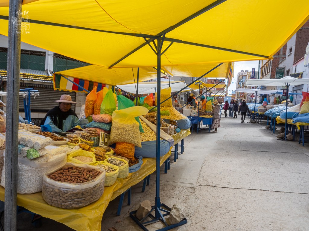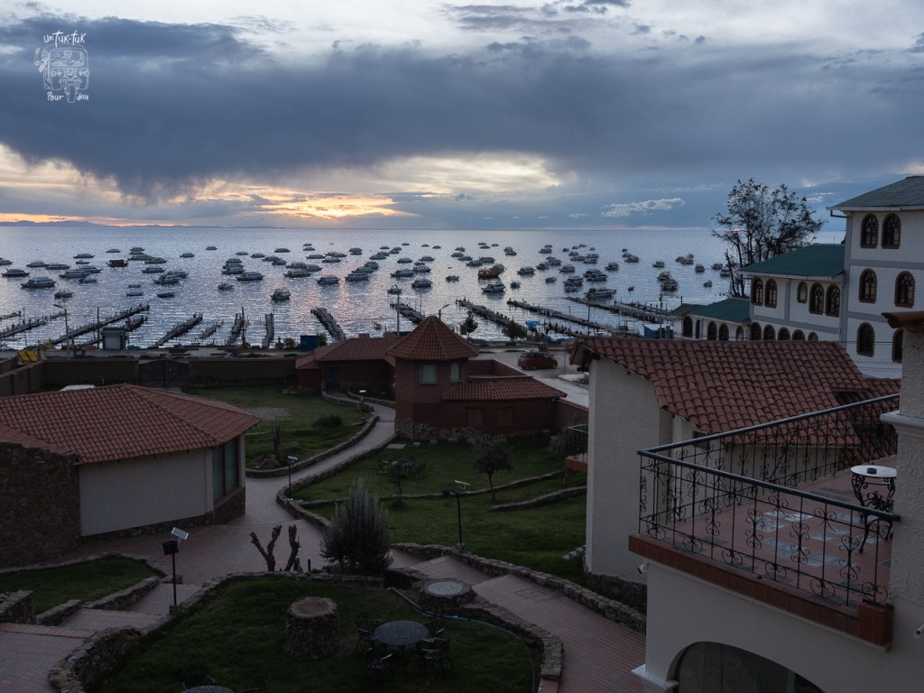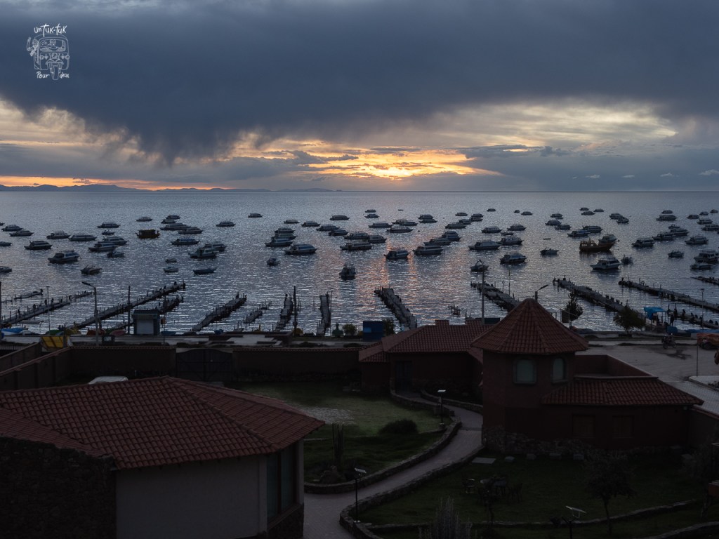 Arrivés en ville, nous nous installons confortablement à notre hôtel et allons marcher sur la berge du lac et dans les quelques rues touristiques. Il y a évidemment des restaurants, des boutiques de souvenirs et des voyagistes qui organisent des tours à la Isla del Sol. C’est la plus grande île du lac — environ 10 km par 5 km — et elle compte encore quelque 2000 habitants, des Quechuas et des Aymaras répartis dans trois villages et qui vivent surtout de l’agriculture. Depuis les dernières années, le tourisme s’est beaucoup développé et il y aurait de plus en plus d’auberges et de restos. L’intérêt de Isla del sol c’est bien sûr les nombreux vestiges incas, l’île constituant le berceau de cette civilisation ainsi que la tranquillité, il n’y a ni route ni véhicule à moteur, et les vues magnifiques sur le lac. Nous nous informons sur les circuits et les départs pour le lendemain.