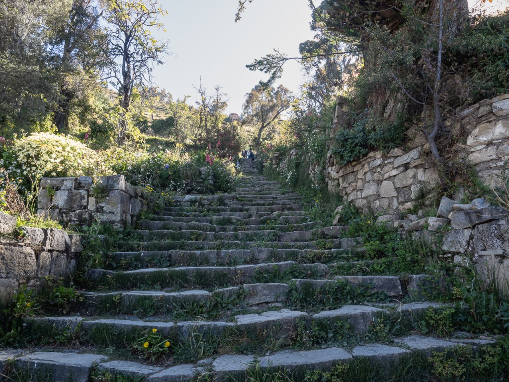 À l’heure dite — le bateau rempli à pleine capacité —, c’est parti pour une heure quinze de traversée. Le guide/animateur de la croisière, après les mesures de sécurité, explique les activités possibles sur l’île, et propose un tour guidé, que nous acceptons pour 30 bolivianos — 6 $CAN — par personne. En arrivant, nous prenons l’escalier des Incas, en pierre évidemment, qui nous amène presque au sommet de l’île. Il faut y aller tranquillement et ne pas oublier que nous nous retrouvons à plus de 4000 m d’altitude. À mi-chemin, il y a une fontaine datant de la période inca d’où sort une eau magique censée donner la jeunesse éternelle. Le guide nous avise de ne pas boire cette eau, mais ça ne dérange aucunement les membres du groupe qui sont tous Boliviens à part nous. Faisant fi des instructions, plusieurs s’y abreuvent tout en faisant un vœu, même s’ils ne sont plus des jeunots…