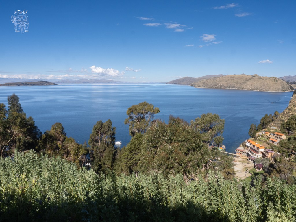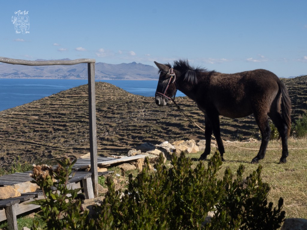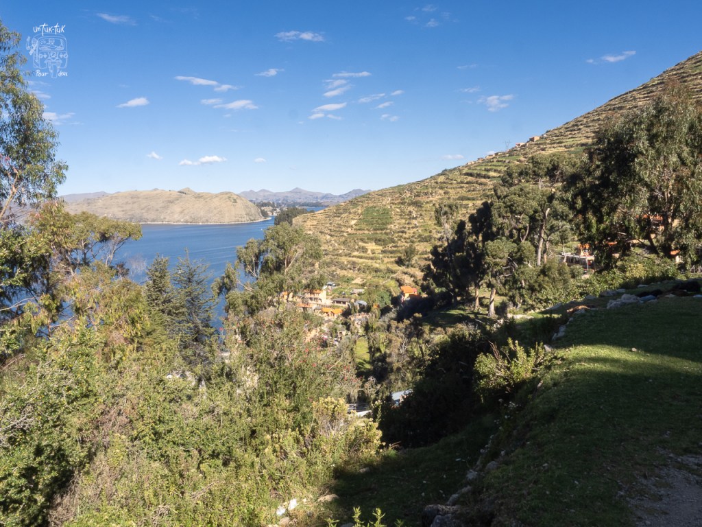 Nous suivons par la suite un sentier sur la crête de l’île. C’est de toute beauté. On croise quelques petites auberges et on se dit que ç’aurait été bien agréable de dormir une nuit sur l’île, comme le suggère fortement d’ailleurs le Lonely Planet. Tant pis ! Nous nous pausons sur le terrain d’une famille qui a le sens des affaires. Le fils d’à peine 10 ans vend des breloques de toutes sortes — il en compte même plusieurs kits différents lui permettant de venir nous voir plusieurs fois en proposant d’autres produits. L’adolescente offre de prendre une photo avec leur lama alors que la mère sert le thé, moyennant des contributions évidemment. Mais tout ça est fait avec douceur, discrétion et sans aucune pression de sorte que ce n’est pas irritant et que dire du panorama.